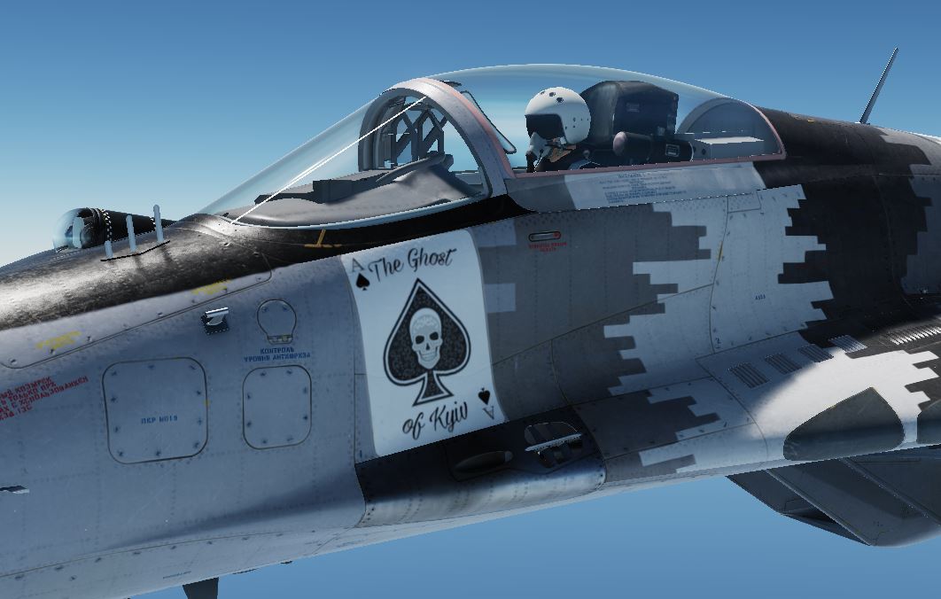 First version of the Ukrainian Air Force urban legend "Ghost of Kyiv". Livery is an assumption from several legitimate news reports and screenshots they contain. 102 number is from one of those screenshots. Livery also contains the fictional 6 stars for the 6 planes the pilot shot down. Livery also contains the fictional "Ghost of Kyiv" Ace of Spades. As new info emerges, livery will be updated.