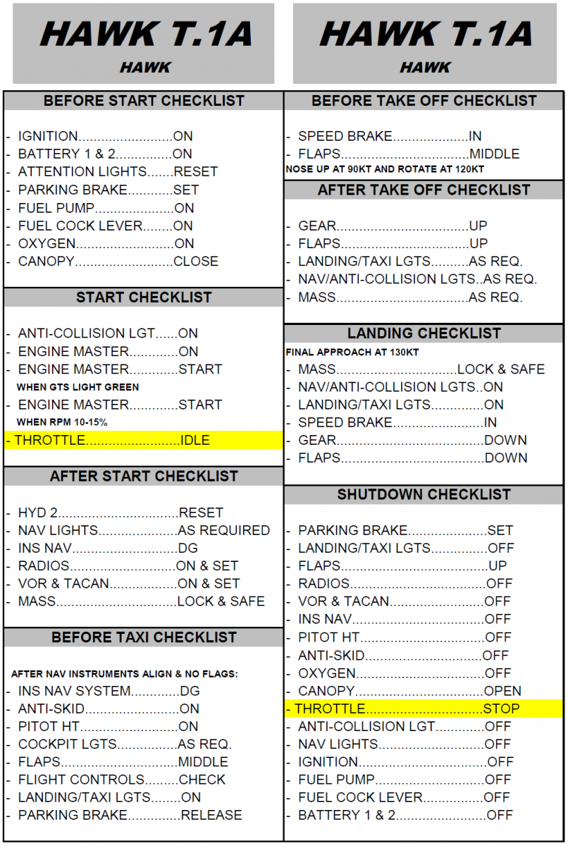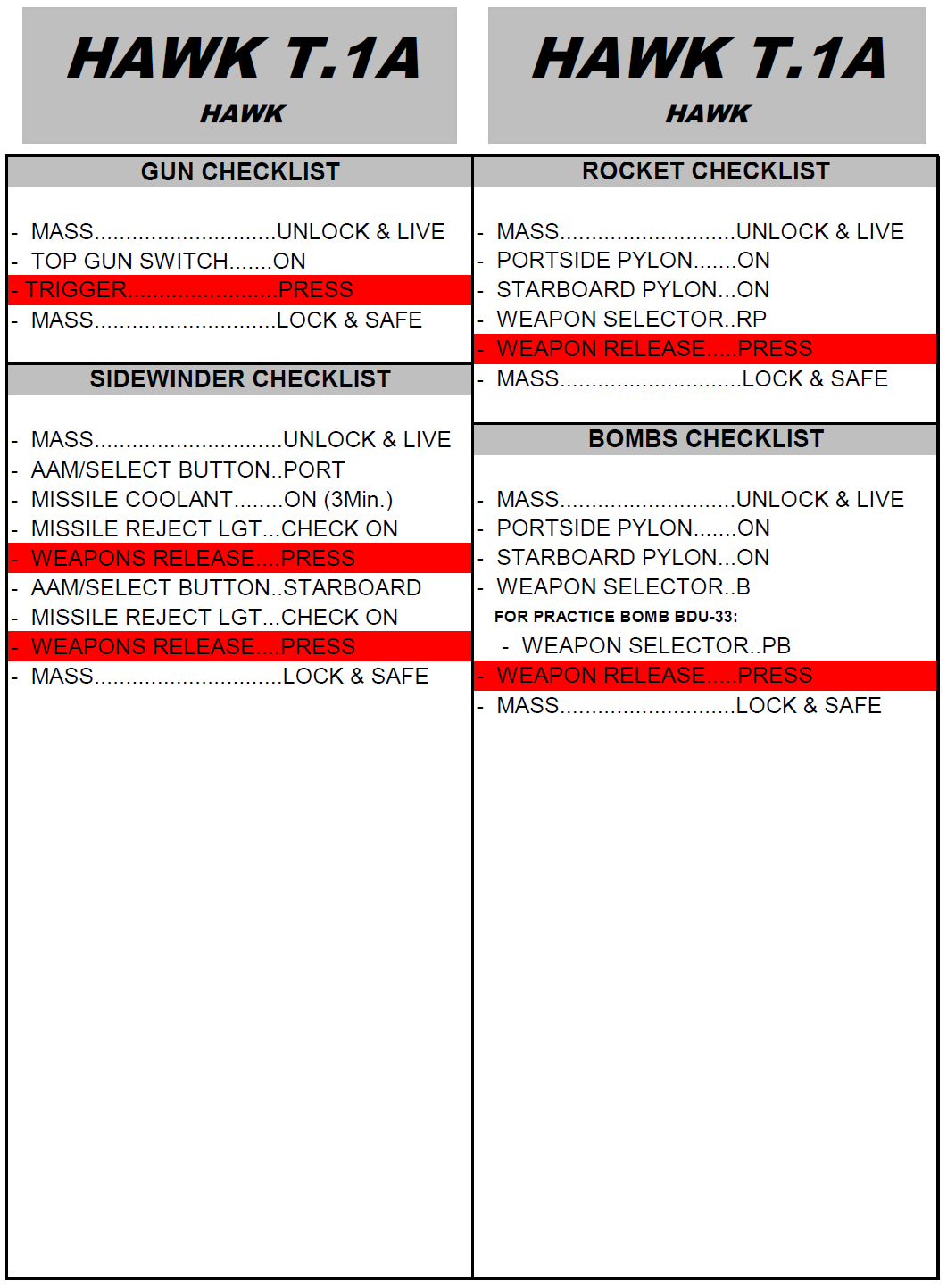 Hawk T.1A Quick Checklist and Weapons Checklist.