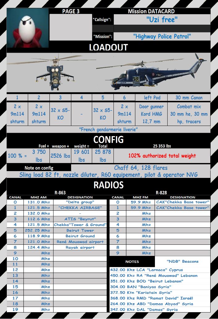 The mission is written for SA-342 Gazelle as Scout, Mi-24P Hind as Gunship and requires the Syria map. The mission can be modified to utilise other helicopters.