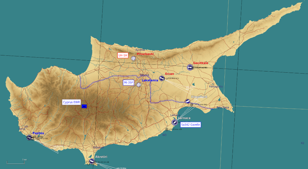 Since 1974 Cyprus is divided between Cyprus pro-Turkish population to the north and Cyprus pro-Greek population to the south. June 2004,Pro-Turkish forces are trying to circle Nicosia with surprised light columms attack. Their hope is to capture the city and win lot more territorial possessions. Your unit will try to resist and destroy those weak enemy columns in the suburbs of Nicosia. You are equiped with Mi-35P Hind and SA-342 Gazelle. Intel think that Turkey is ready to support massively this attack and our hope is that Greek army will help us if that occured.