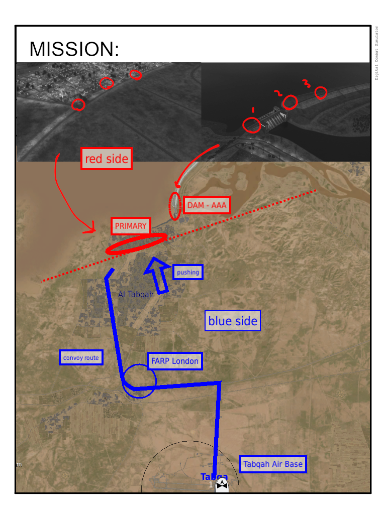 -  July 21 2016 - ( Fictional ) The Coalition for the freedom of Syria (CFS) take control of the airbase of Tabqah (under control of ISIS) and now is fighting in the City. The coalition will send a convoy to eliminate the insurgents over the north of the city and the dam. The US army will give them support from the air with two AH-64D Apaches that have to destroy enemys position before the convoy reach the front, and provide some CAS.