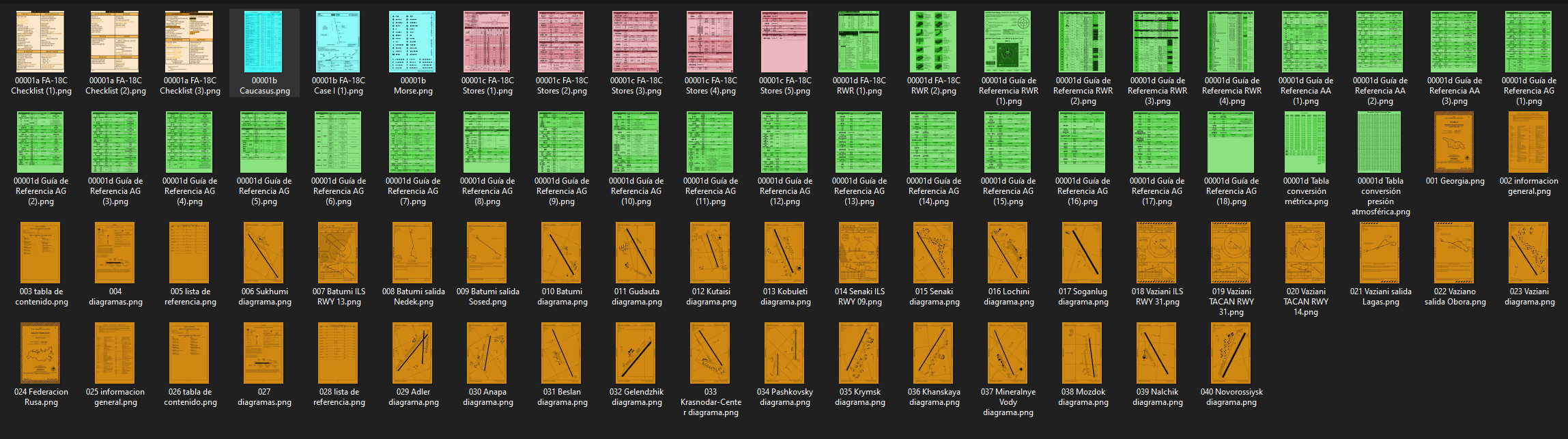 Custom kneeboards for A-4E-C, AV-8B, FA-18C, J11-A, Jf-17, Ka-50, Mi-24P, MiG-21bis, Su-25A, Su-25T, Su-27 modules , Su-33 and T-45 as well as for the Caucasus, Persian Gulf, Marian Islands and Syria maps.