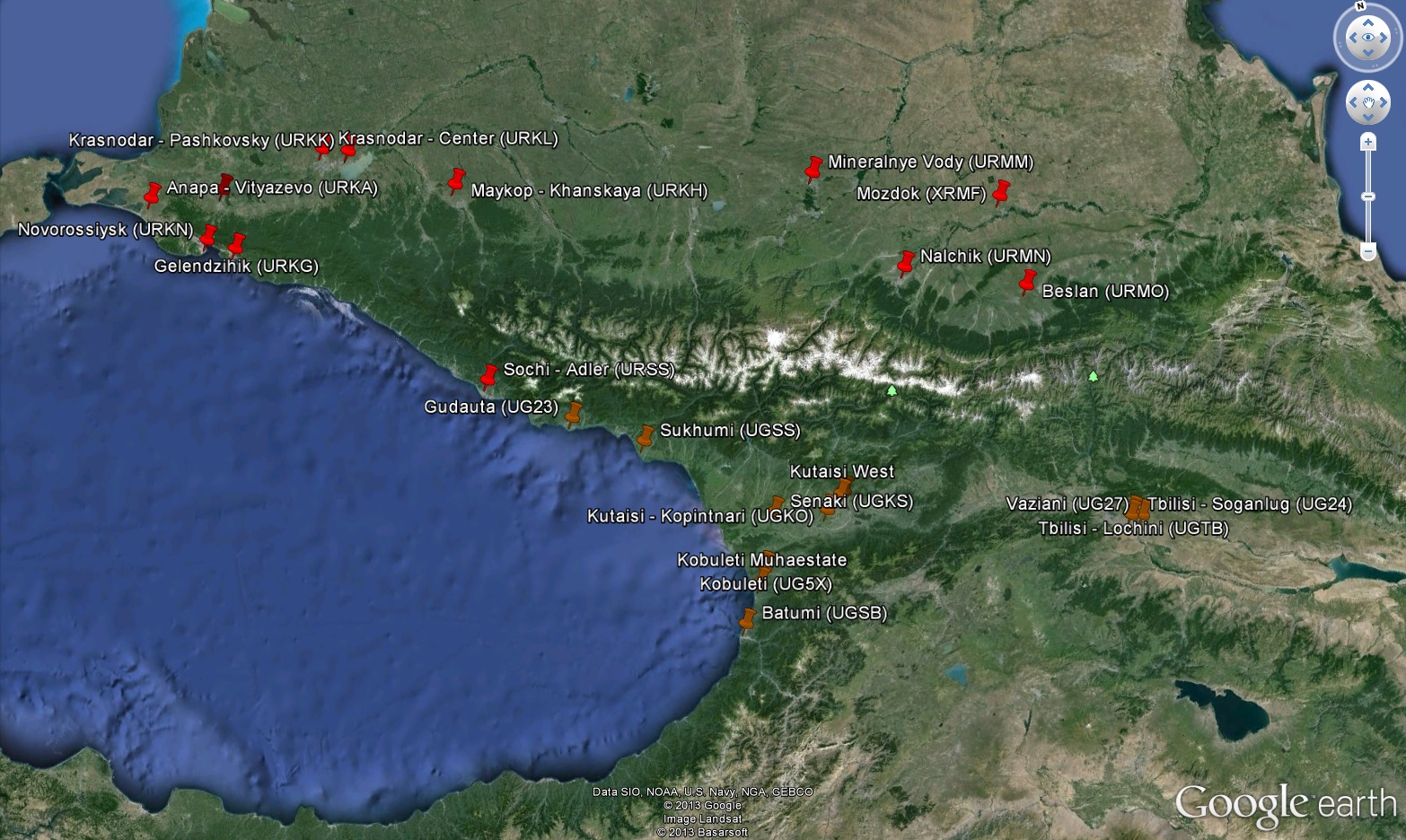 A KMZ file, includes all the Russian and Georgian airports with their respectives TWR, TACAN and ILS frequencies.