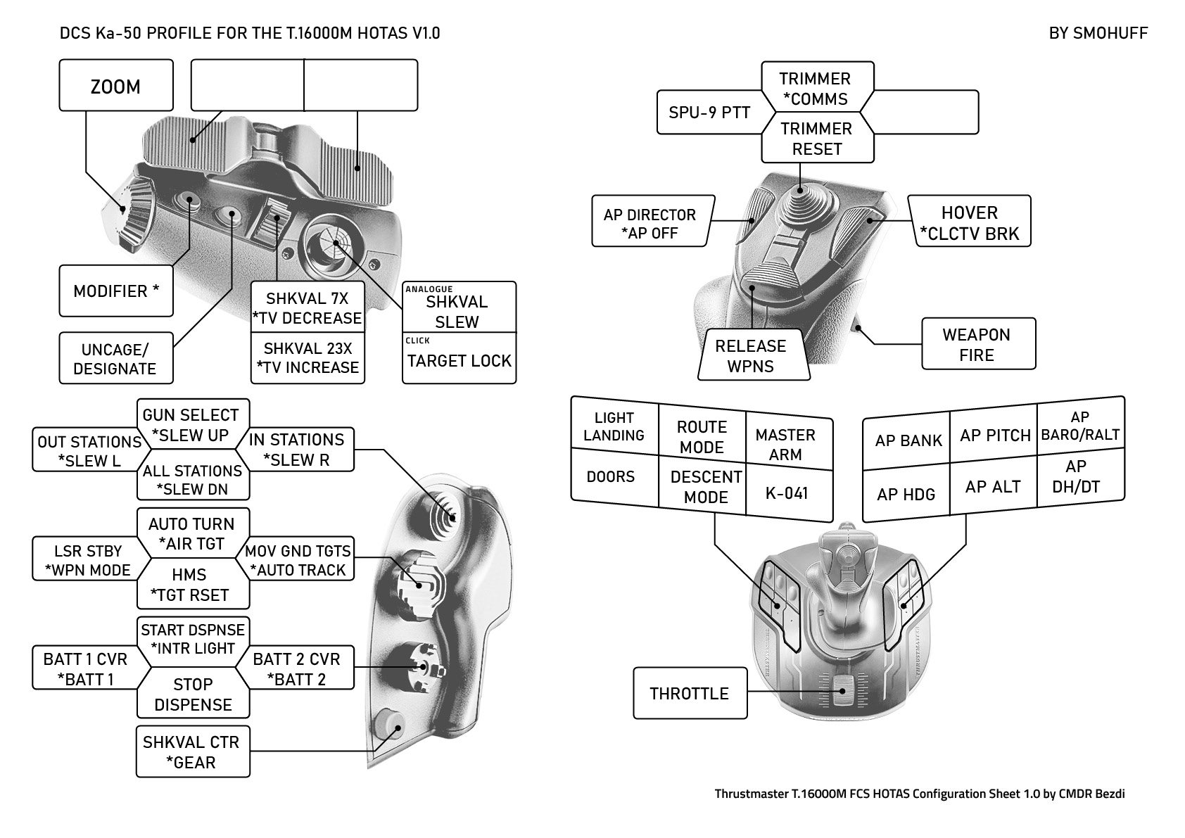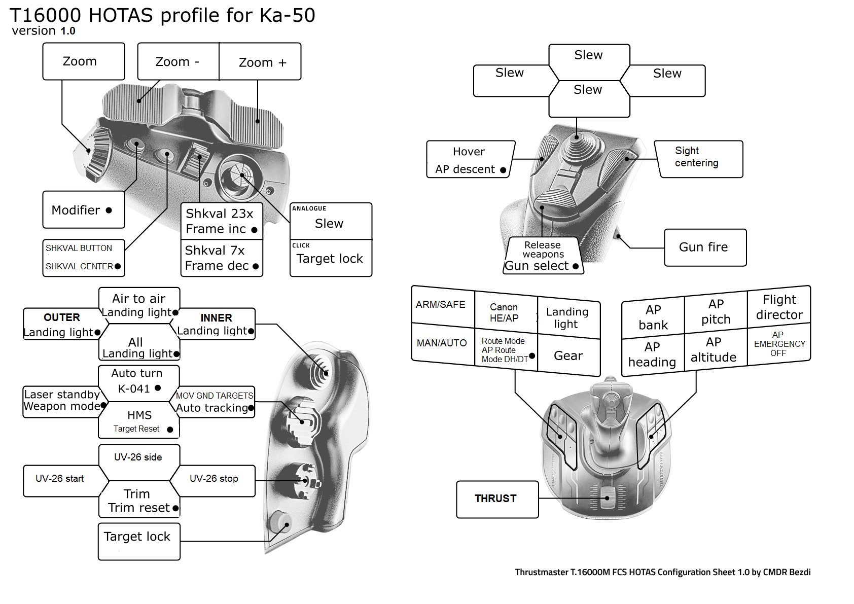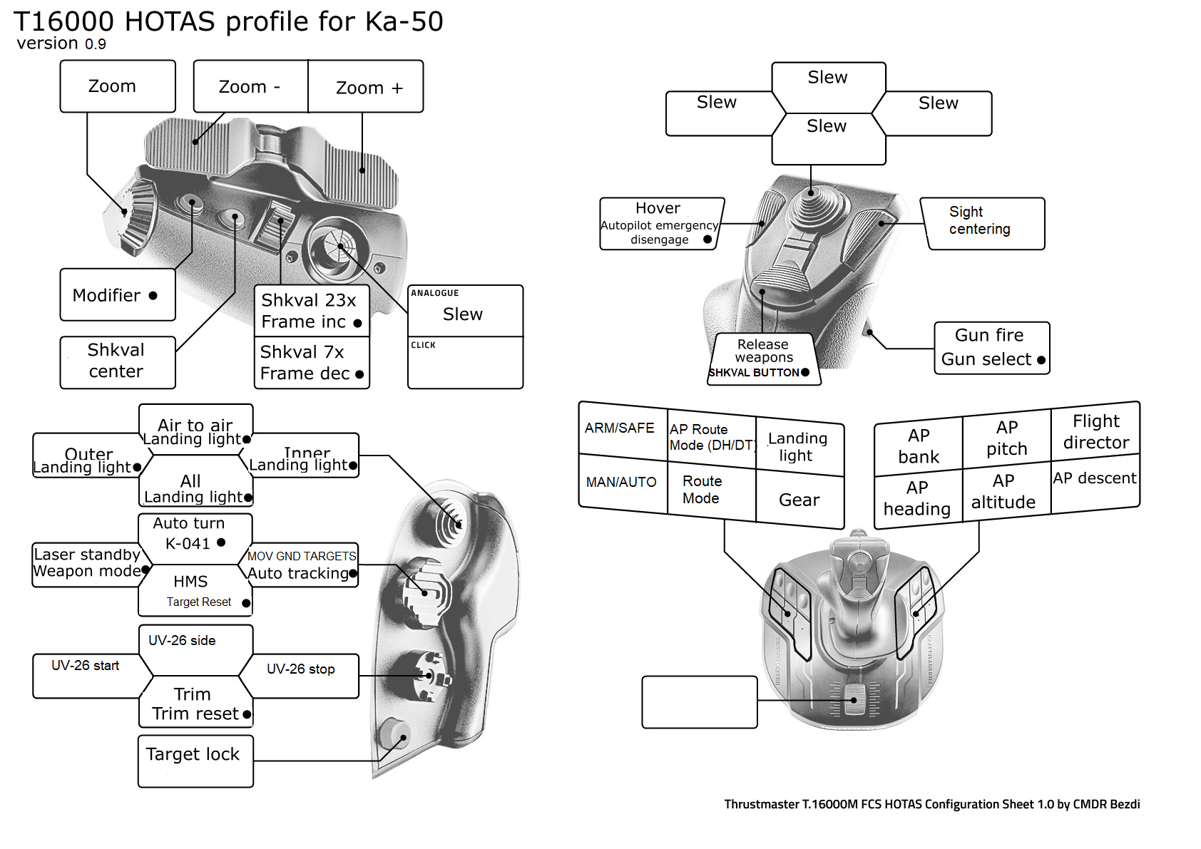 This is my Ka-50 profile for the T16000M HOTAS, it has been created with rudder pedals and TrackIR/VR in mind so rudder, brakes and POV movement are not bound into the HOTAS. But can be modified as required.