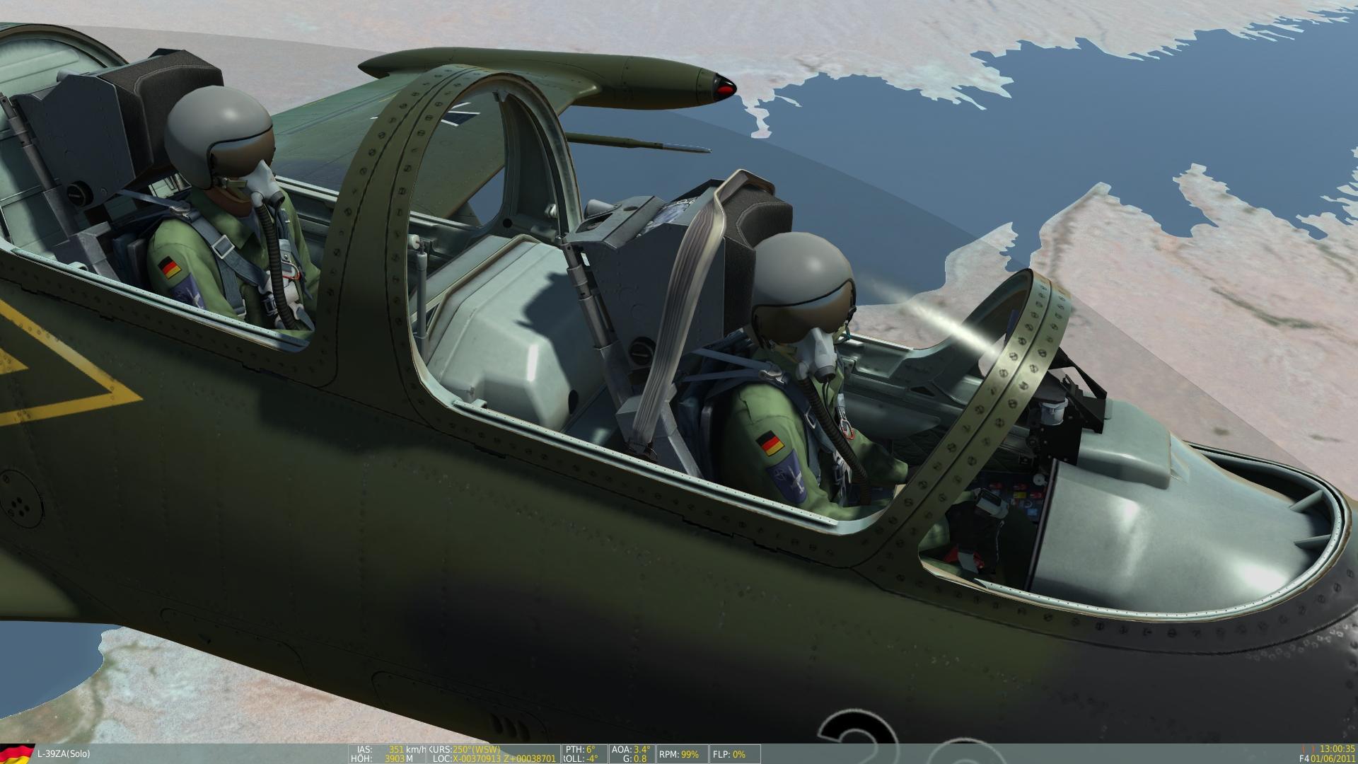 A fictional German Air Force skin for the L-39ZA based on the camouflage scheme NORM 62 and the orange flight suit/white helmet used by the Air Force Fighter-Bomber Wing 34 (Jagdbombergeschwader 34) in the nineteen sixties for the F-104G Starfighter. Fighter-Bomber Wing 34 was inactivated in 2003.