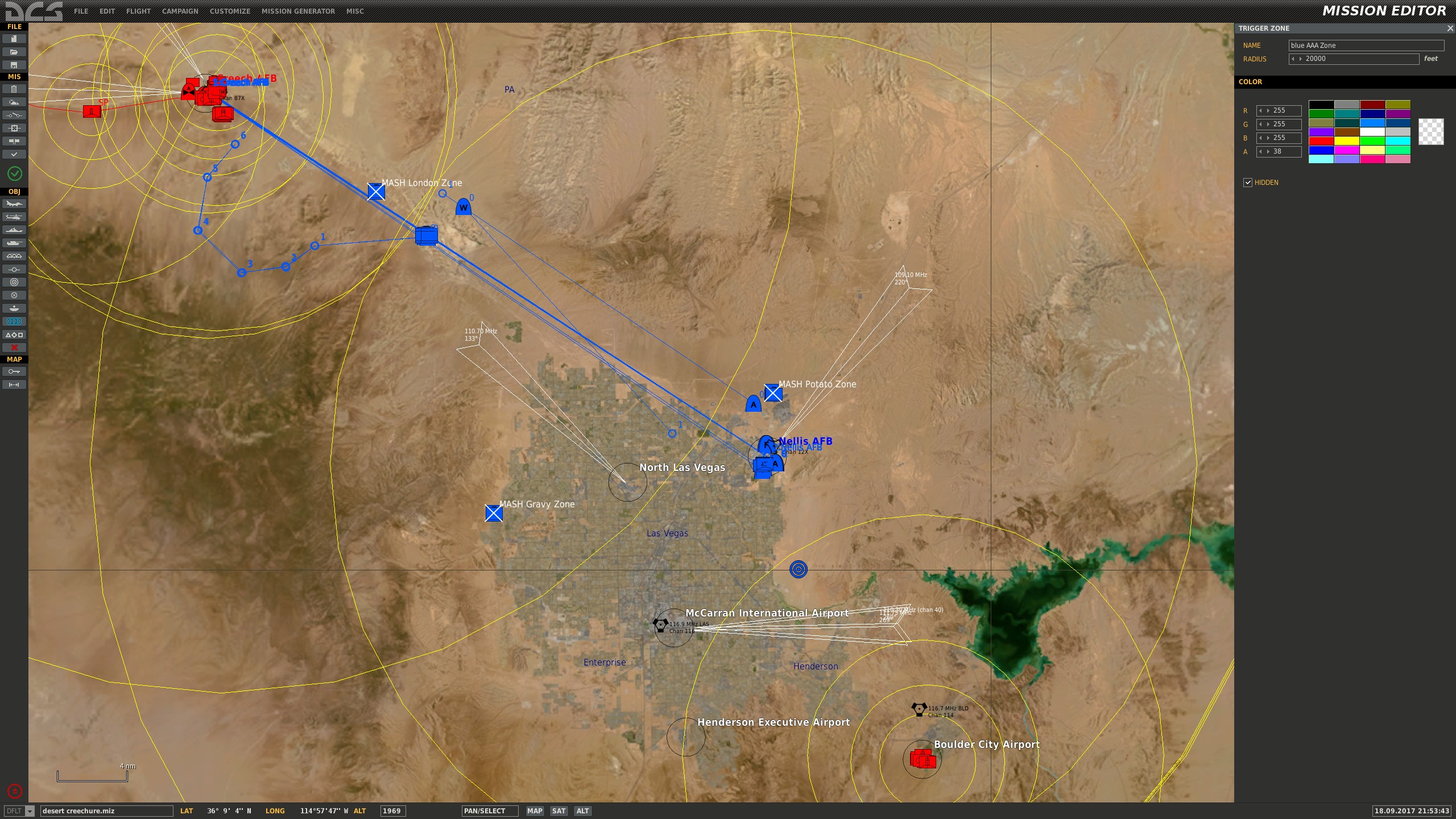 Red and blue forces are battling over control of Nevada. The current front line extends roughly north to south, going through a line half way between Creech AFB (red) and Nellis AFB (blue). Both sides rely heavily on helicopter forces, and to a more limited degree, on airpower. The air battle is largely fought by F-5E and Mig-21bis, with each side seeking air superiority.