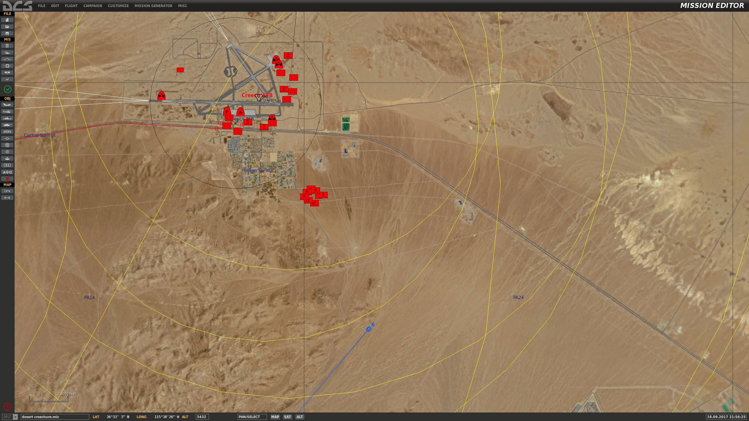 About 22 miles South West of Creech AFB an Enemy Training Camp full of would be Terrorists & Insurgents has been located & must be dealt with. They have assembled various AAA & stock piling some heavy weapon ordnance & an Armored Column is on route to this Base which also must be disrupted. There is also some enemy AC in the area.