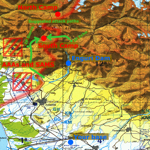 During a night patrol, one of our AH-1W was shot down by a rebel AA. One of the pilots survived the crash and needs extraction ASAP. Georgian forces prepared a Mi-8 to medevac the pilot, but first the area must be secured. A pair of F/A-18C (Enfield 3) will take care of the rebels and cover the chopper until he leaves the area. Our AO is clear of hostile aircrafts, do not enter russian territory (check briefing picture) or you will get shot. AWACS (Overlord) can be contacted in case you need.