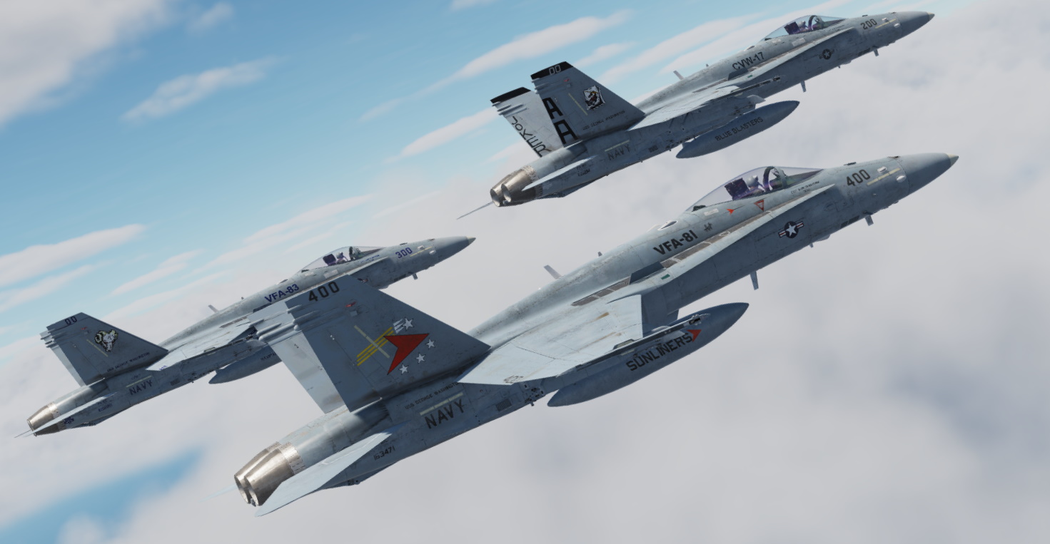 Included are line and CAG skins for VFA-34 (Blue Blasters), VFA-81 (Sunliners) and VFA-83 (Rampagers).