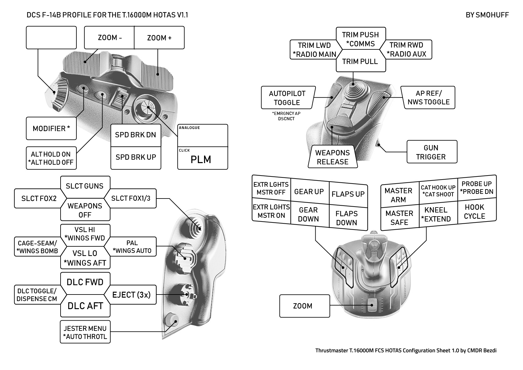 This is my F-14 Tomcat profile for the T16000M HOTAS, it has been created with rudder pedals and TrackIR/VR in mind so rudder, brakes and POV movement are not bound into the HOTAS. But can be modified as required.