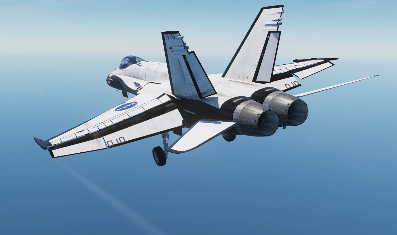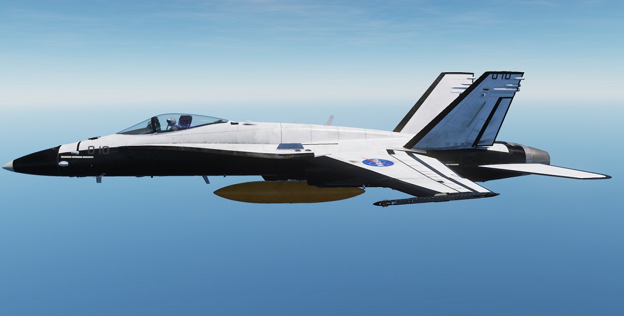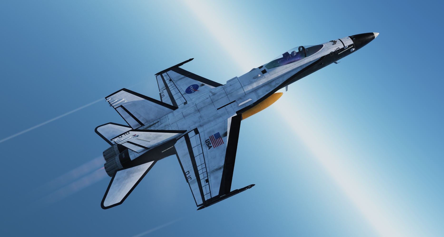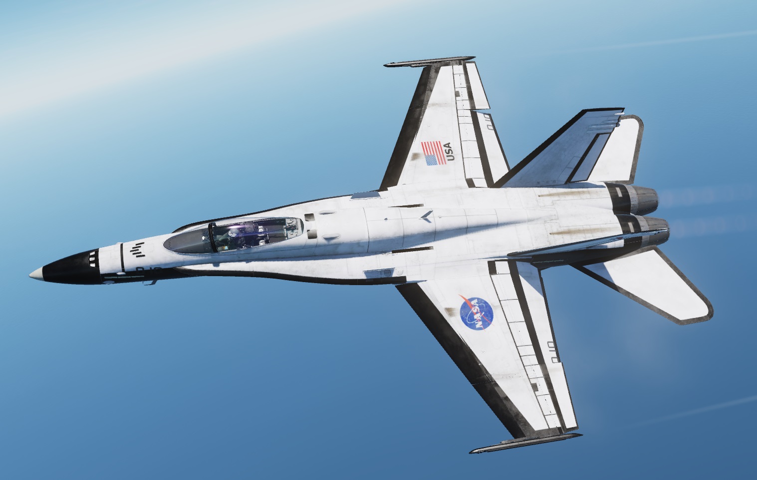 This skin commemorates NASA's Space Shuttle program, which ran from 1972 to 2011. It includes a complete exterior skin for the F/A-18C and its fuel tank. The skin takes inspiration from each of the Space Shuttles and does not mimic a specific Shuttle in particular.