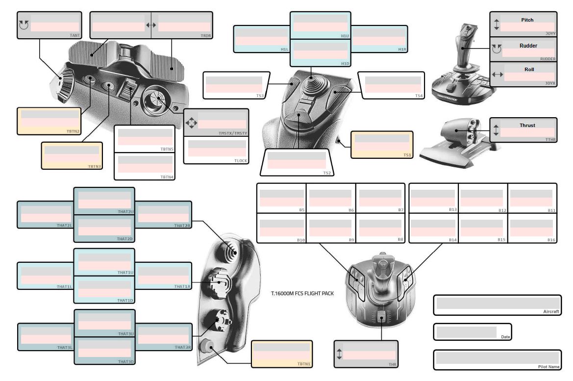 A PDF graphical profile template that can be used to document control binds for a Thrustmaster T.16000m FCS. (Thottle and Stick, No Pedals)