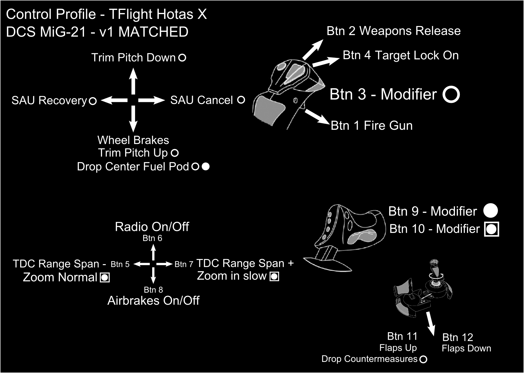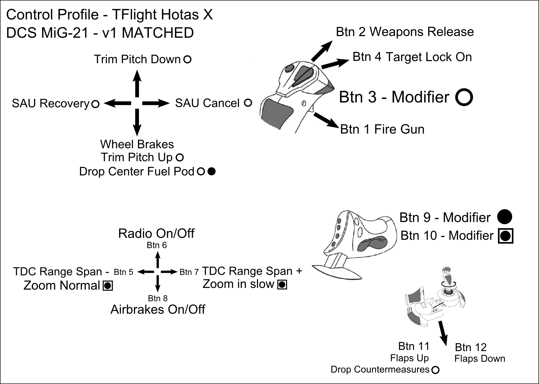 Control profile for the Thrustmaster Tflight HOTAS X joystick in DCS MiG-21bis with attached diagram for easy reference.