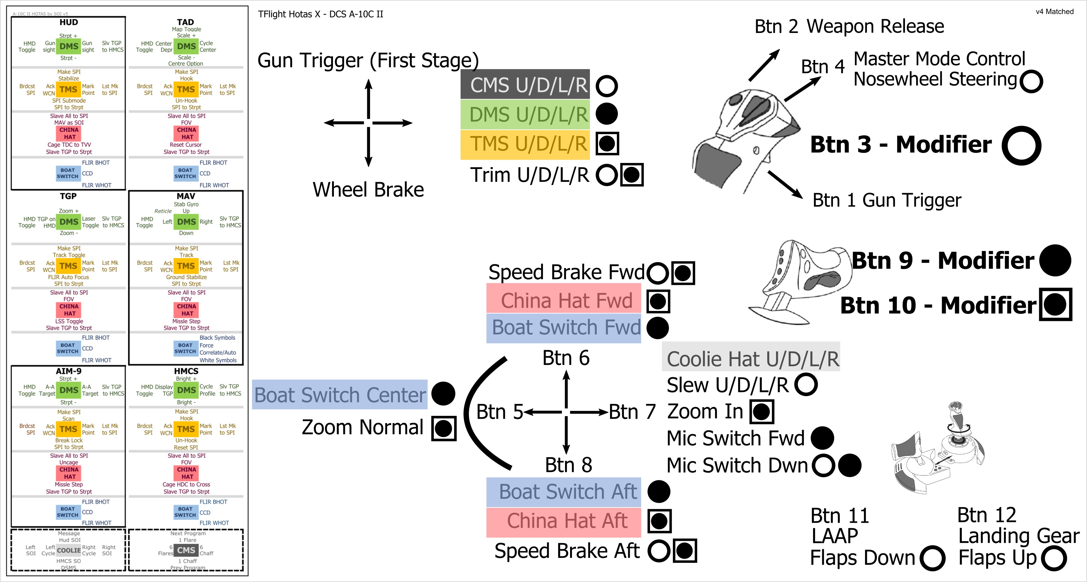 Control profile for the Thrustmaster Tflight HOTAS X joystick in DCS A-10C with attached diagrams for easy reference, including bonus HOTAS by SOI references.