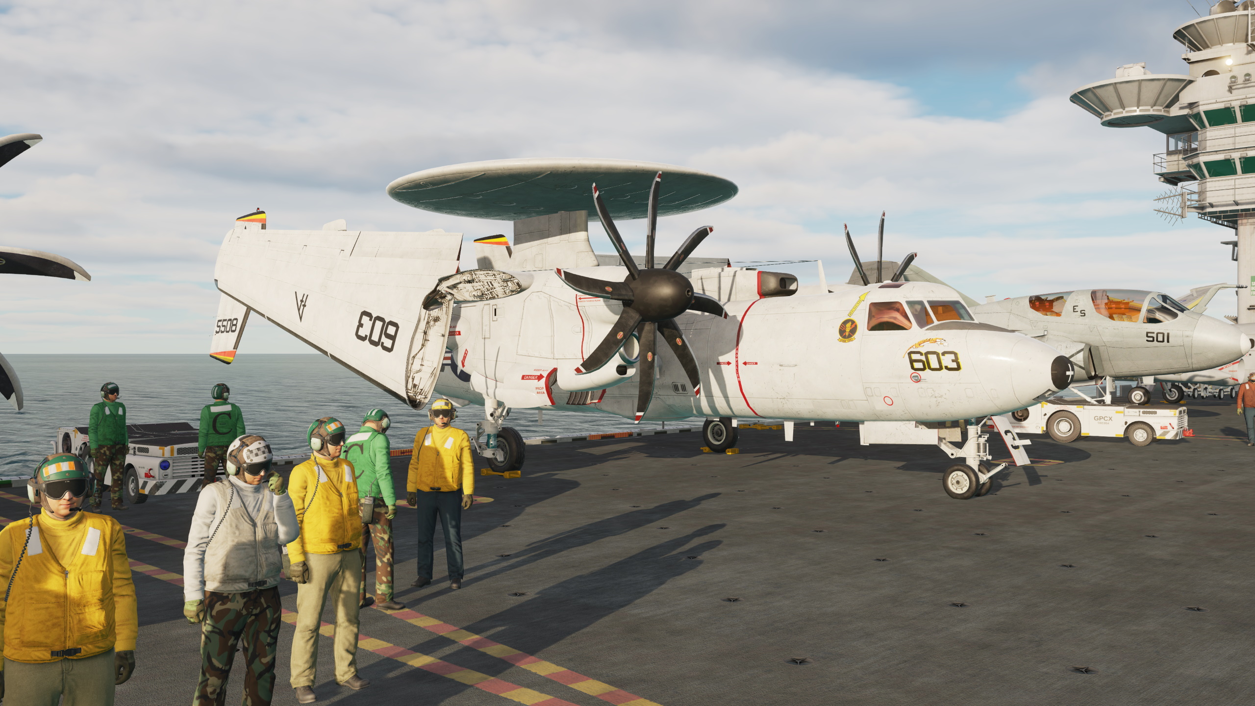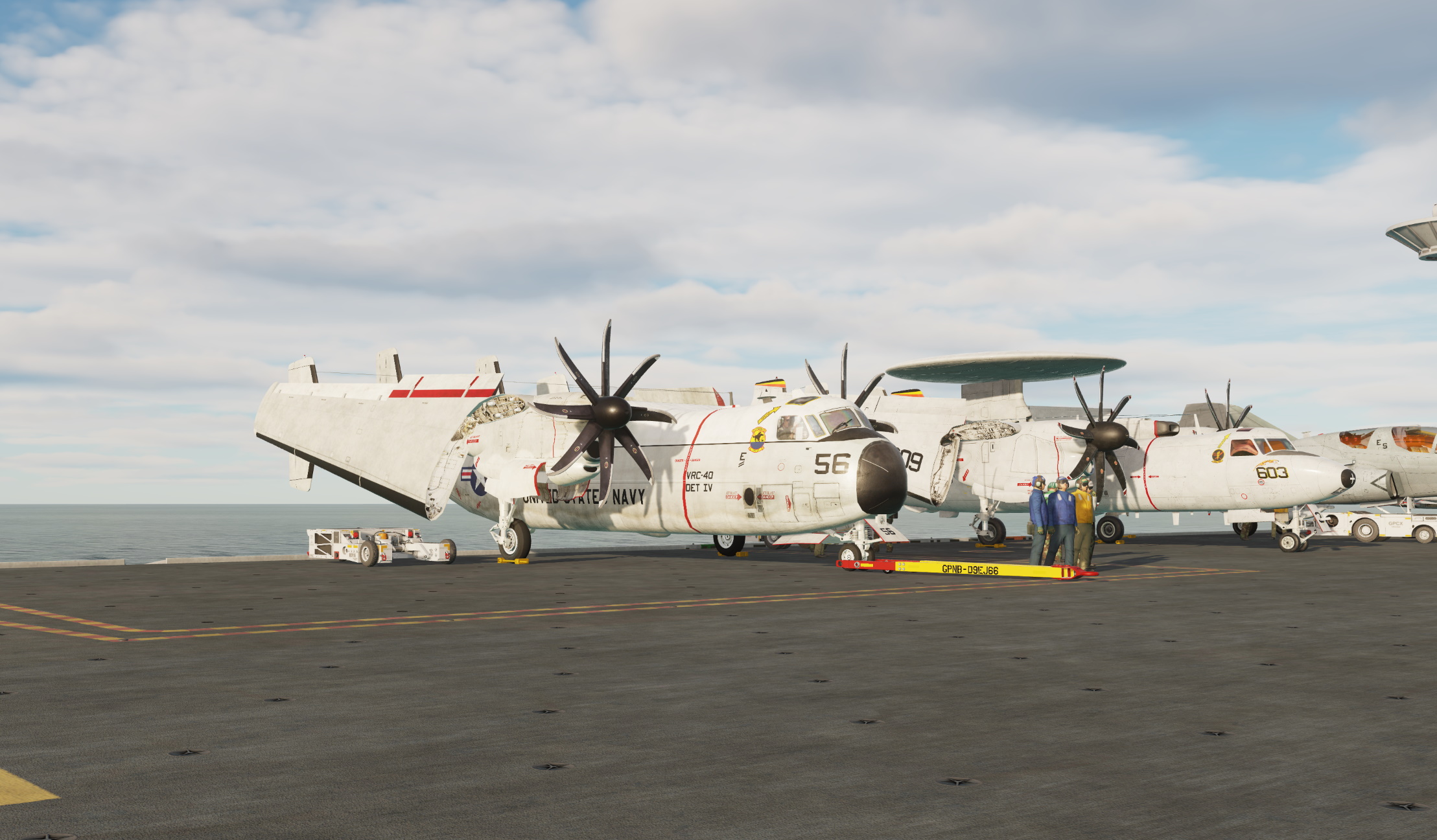 This pack includes two skins for the AI E-2D model: 602 and 603 of VAW-125 "Tigertails". The skins included here depict these aircraft during VAW-125's 2002 cruise aboard George Washington.