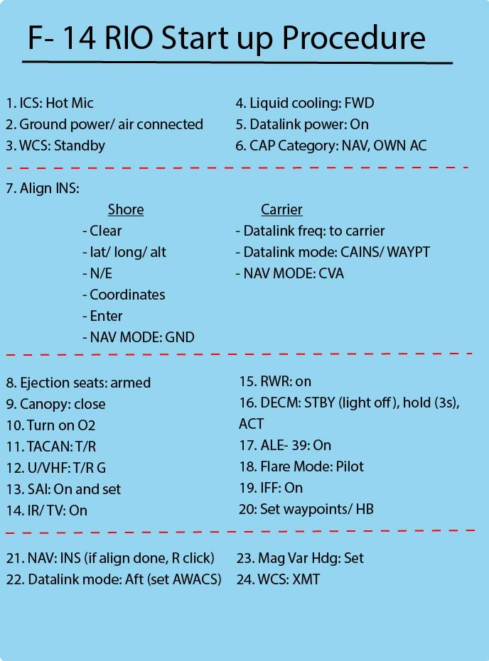 F-14 startup procedure kneeboard for the RIO.  Video walkthrough: https://youtu.be/OIFDm7hNLMo