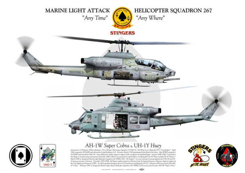 The Marine Expeditionary Unit (MEU) is a deployable, quick reaction air-ground task force of the United States Marine Corps (USMC) that includes both a battalion sized ground and support force as well as a group sized composite air component.  The air assets are pulled from various stateside Marine squadrons and take on the squadron name and tail code of the medium lift squadron (formerly the CH-46 helicopter squadron, now the V-22 tiltrotor squadron), and the medium lift squadron is designated as "Reinforced" (e.g. "VMM-263 (Rein)").  Among the helicopter assets in the MEU are the UH-1N Huey (now the UH-1Y Venom) and the AH-1W Super Cobra or AH-1Z Viper, themselves taken from composite Marine Light Attack Helicopter (HMLA) squadrons.
