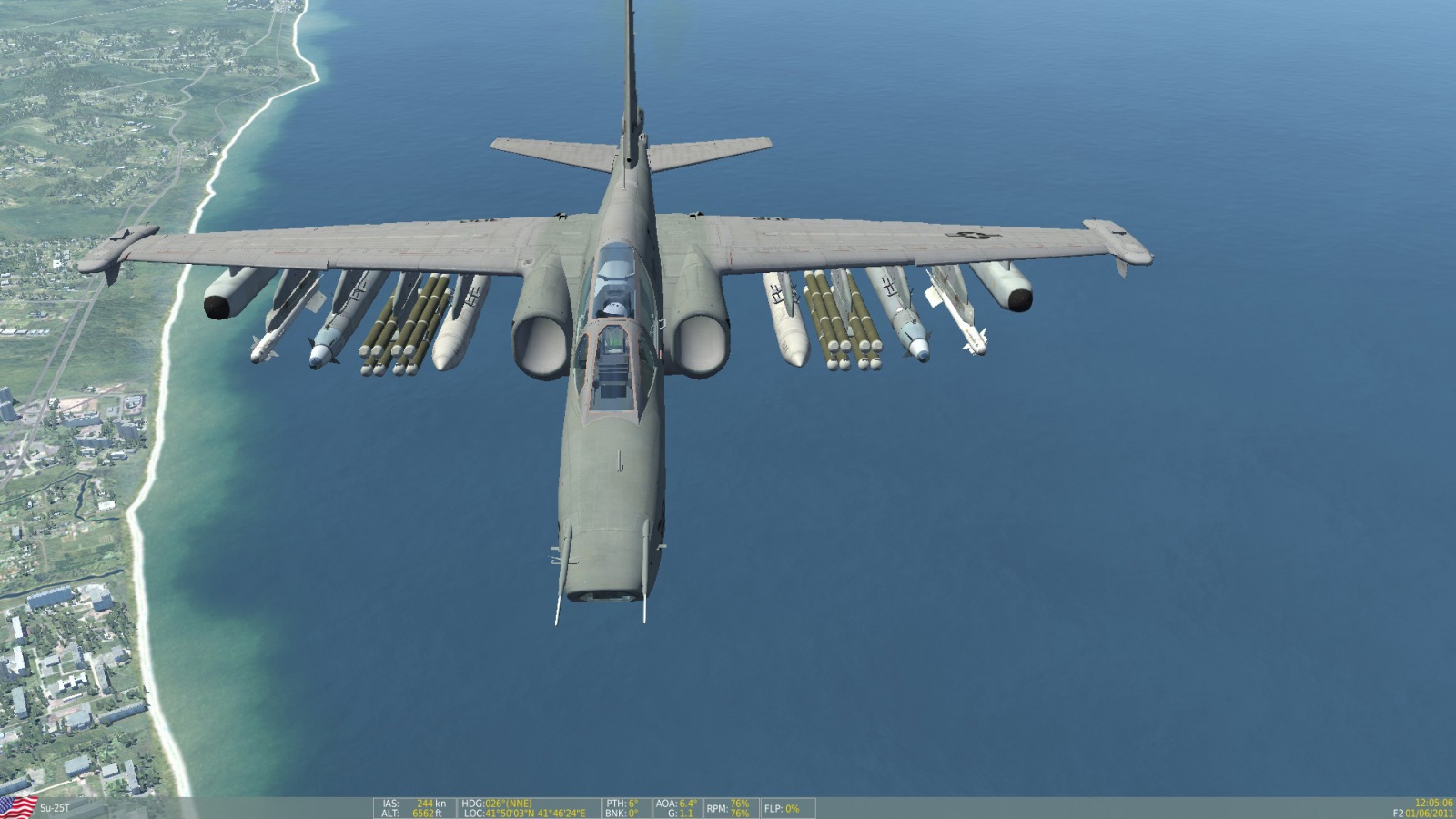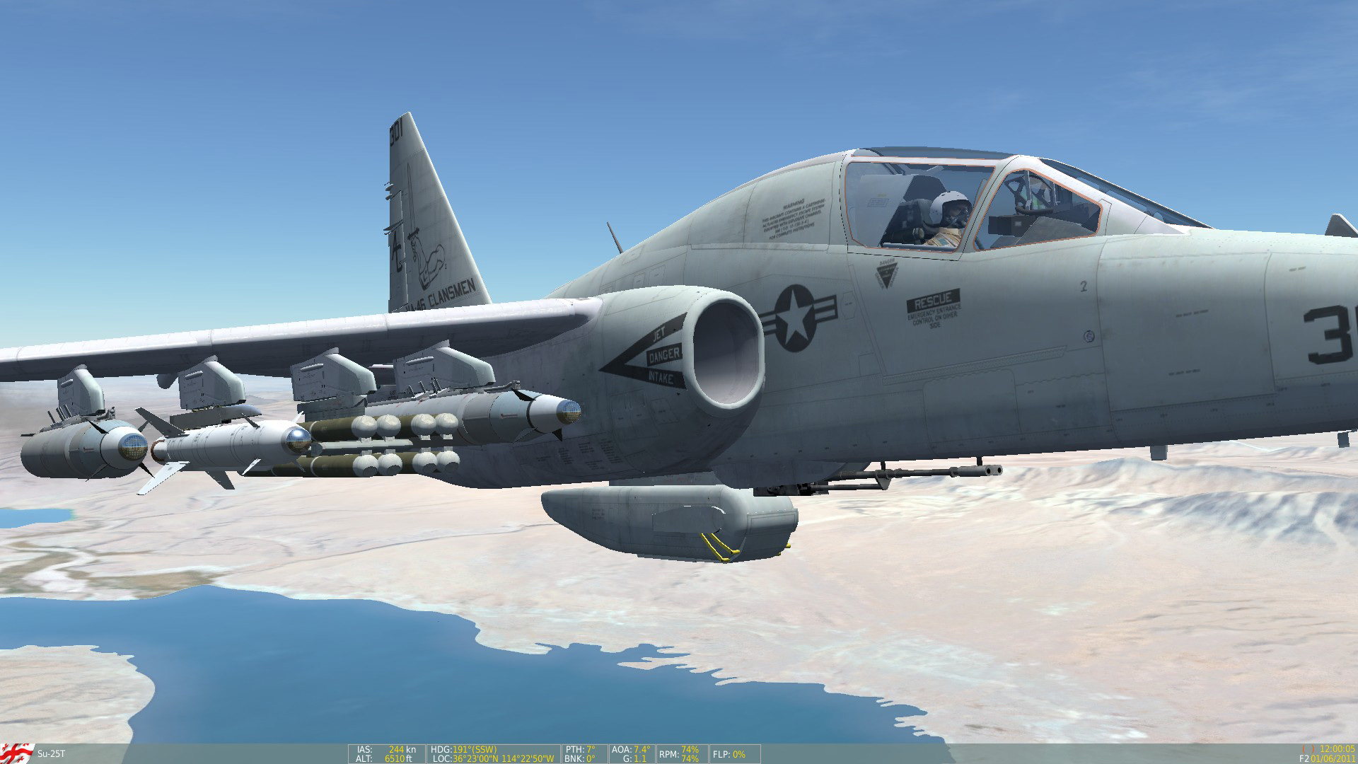 This is a fictional skin pack of Su-25Ts painted like the A-7E Corsair II in accordance with MIL-STD-2161A(AS) with VA-46 markings circa 1991.  There are four different skins with unique Modexes (side numbers) and historically correct BuNos (serial numbers).  VA-46 was one of two A-7 squadrons on in CVW-1 during Desert Storm, the other A-7 squadron being VA-72.  This allows you to create packages of unique aircraft, including two squadrons from the same air wing.  Each skin has a "normal" version and a weathered version.  Weathered skins have a bleached effect as if the aircraft were heavily exposed to the sun for months on end.  Normal skins include pilots with green flightsuits, while weathered skins include pilots with desert flightsuits.