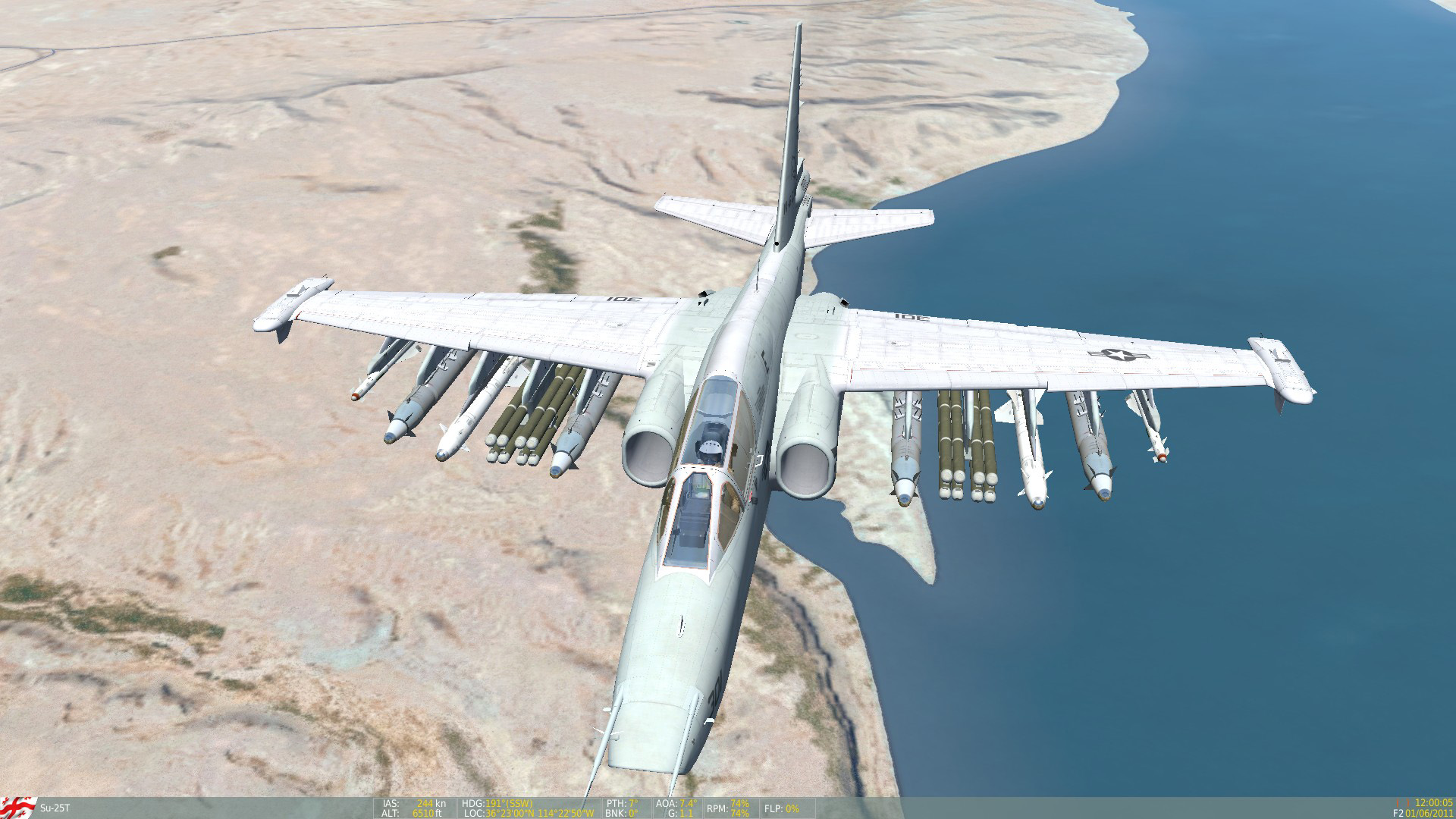 This is a fictional skin pack of Su-25s painted like the A-7E Corsair II in accordance with MIL-STD-2161A(AS) with VA-46 markings circa 1991.  There are four different skins with unique Modexes (side numbers) and historically correct BuNos (serial numbers).  VA-46 was one of two A-7 squadrons on in CVW-1 during Desert Storm, the other A-7 squadron being VA-72.  This allows you to create packages of unique aircraft, including two squadrons from the same air wing.  Each skin has a "normal" version and a weathered version.  Weathered skins have a bleached effect as if the aircraft were heavily exposed to the sun for months on end.  Normal skins include pilots with green flightsuits, while weathered skins include pilots with desert flightsuits.
