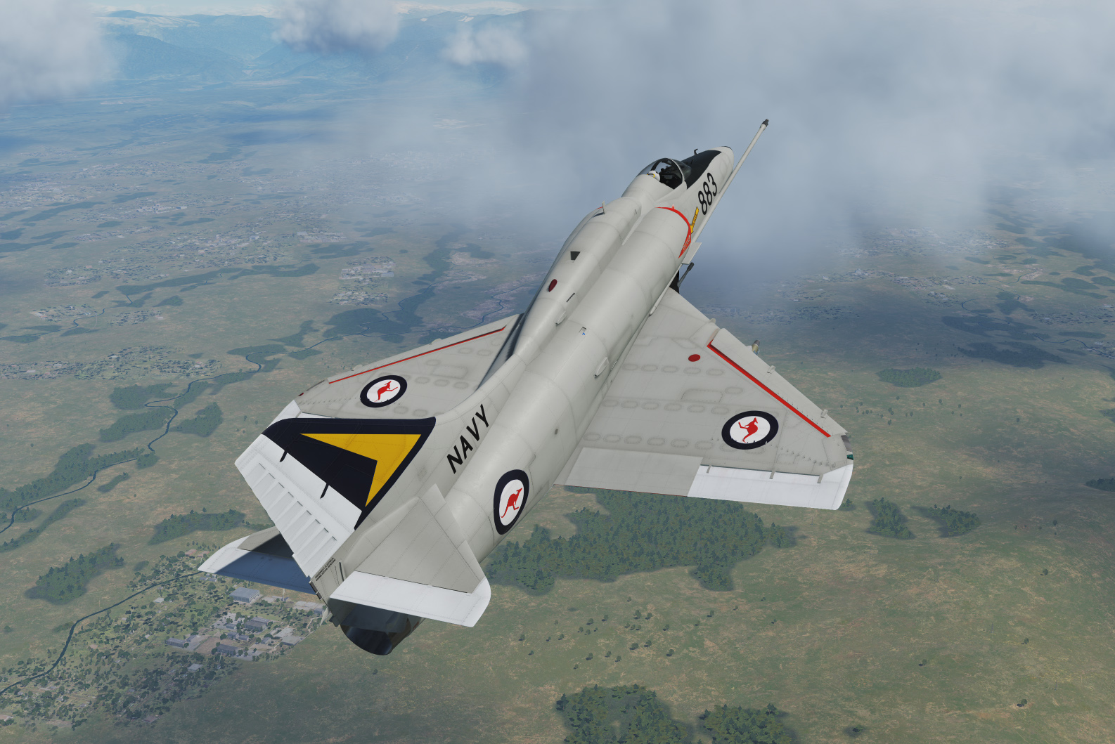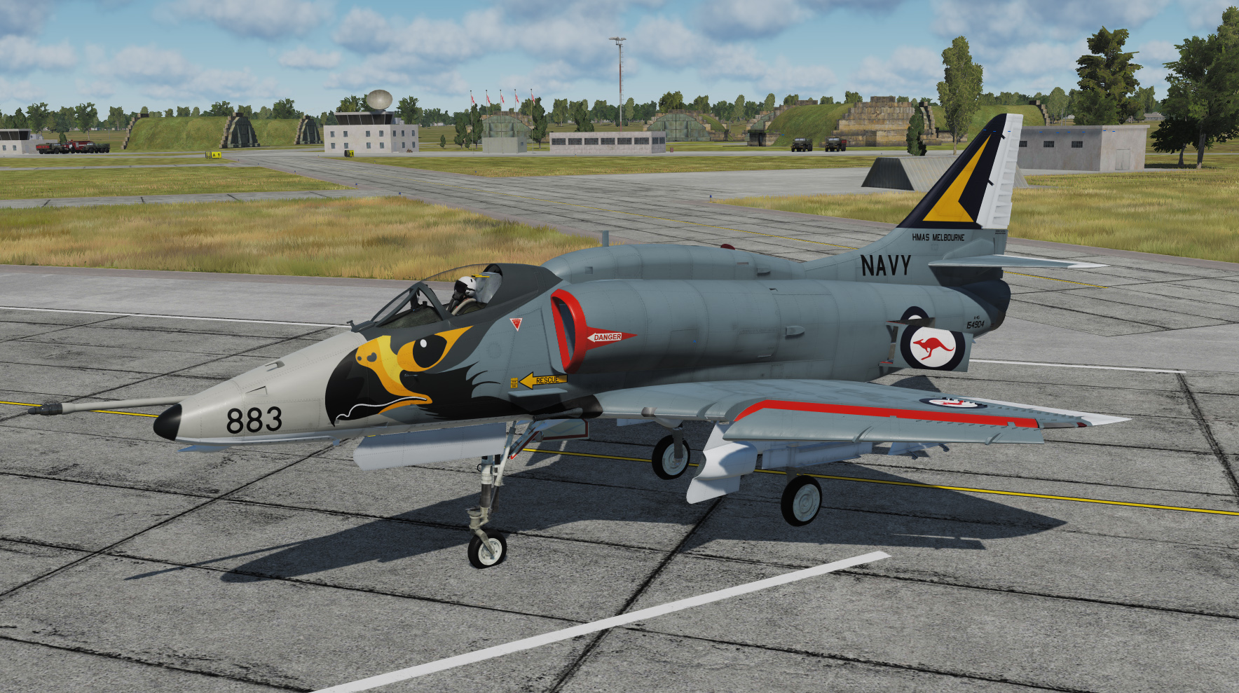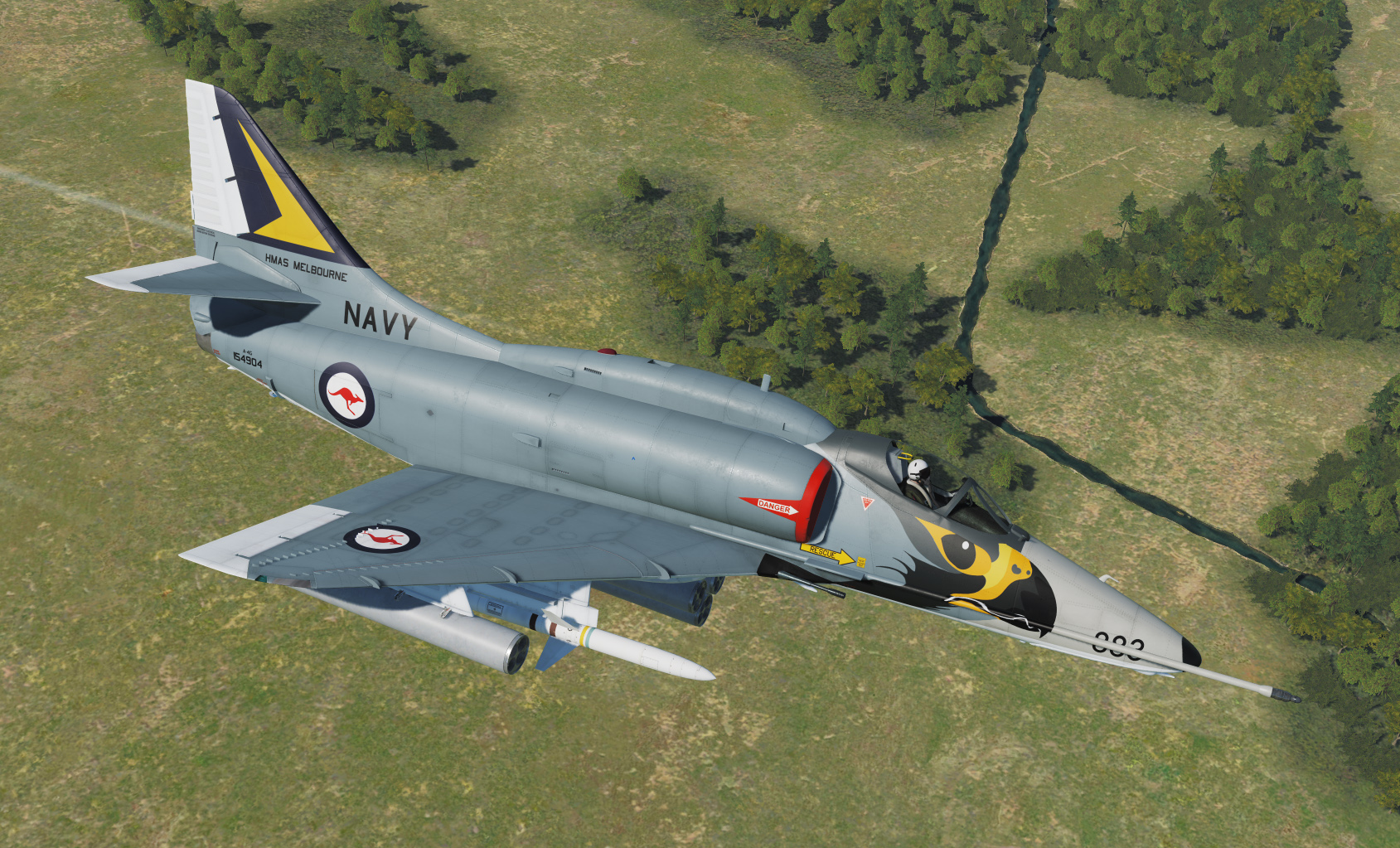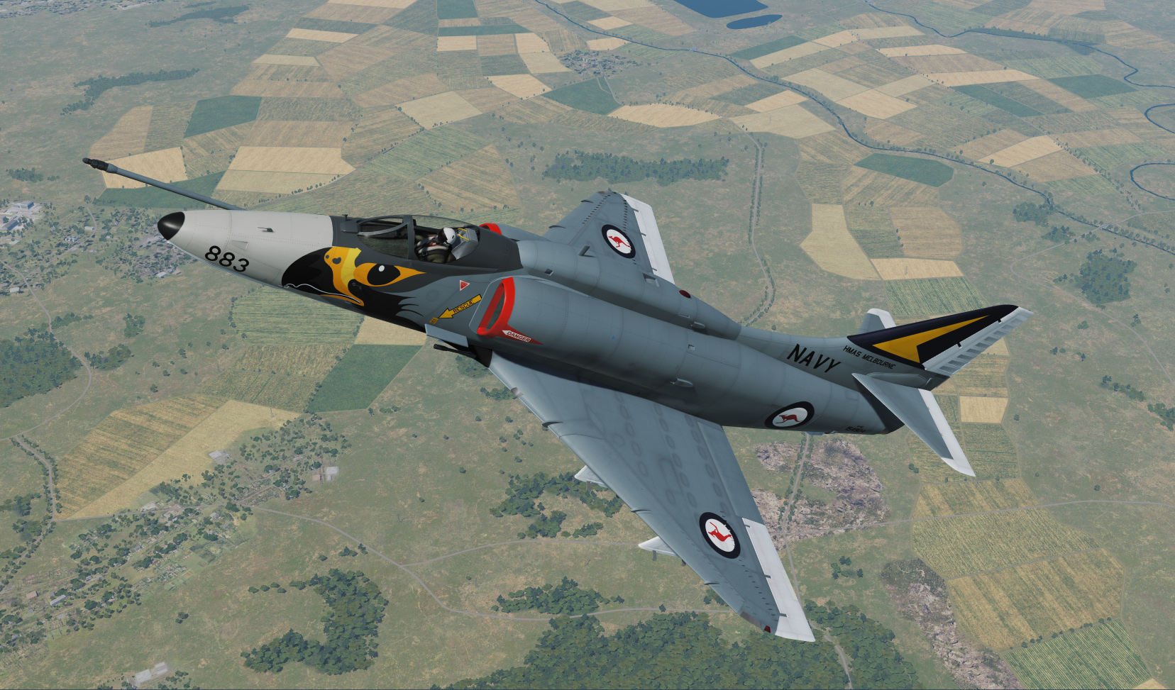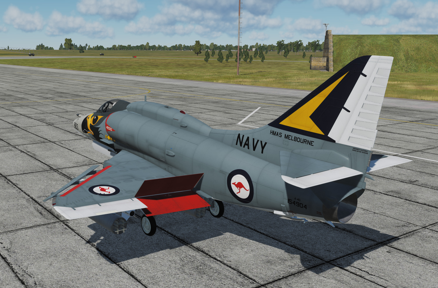 A fictional skin based on a blend of the Gull Grey/Insignia White hi-vis of the Royal Australian Navy VC-724 Squadron, and the US Navy of the 1970s, but with the hawk's head from the Brazilian Navy's AF-1 (A-4KU Skyhawk) and darker grey of the aircraft depicted here: