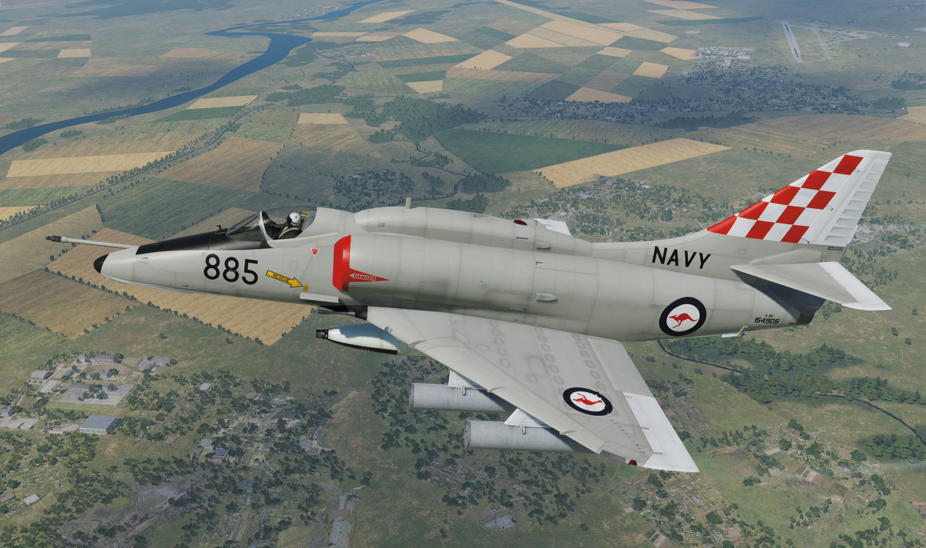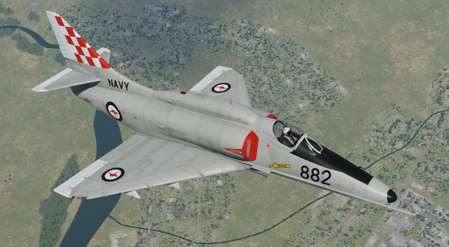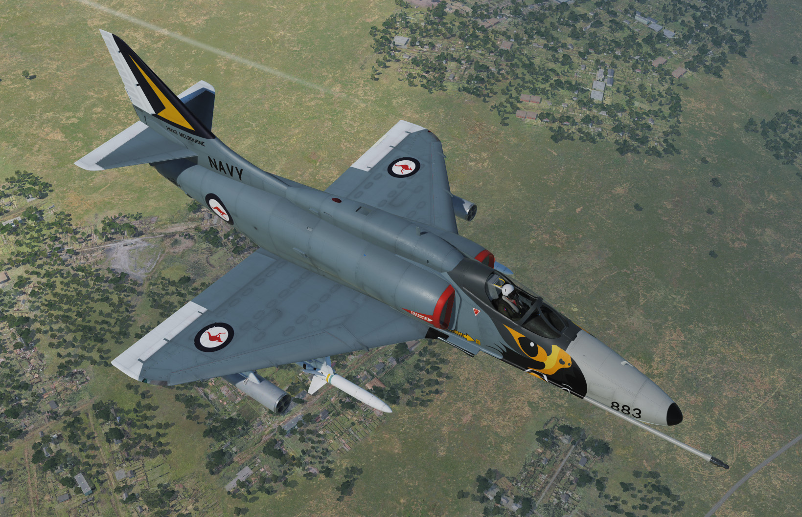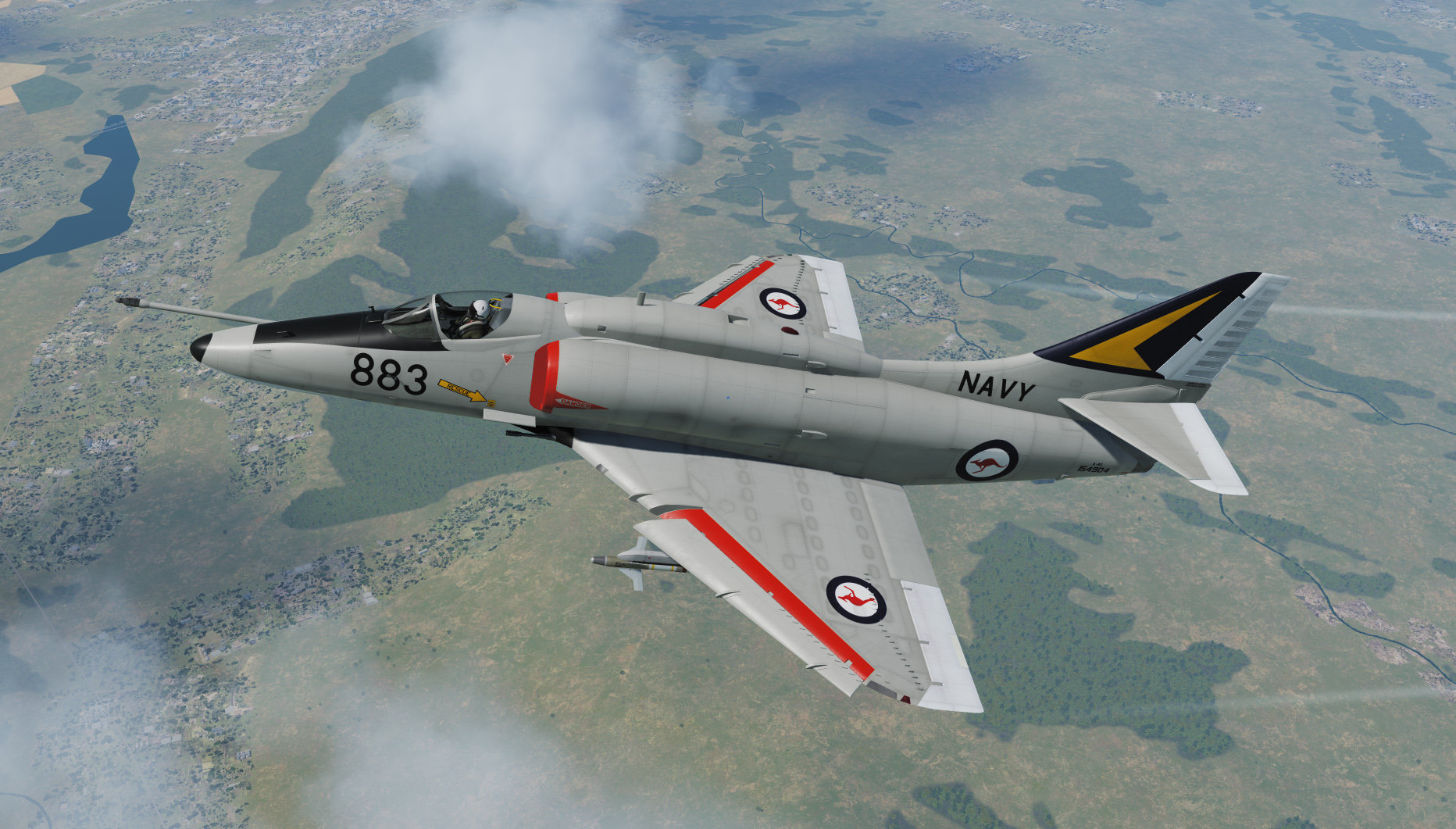 A fictional skin based on a blend of the Gull Grey/Insignia White hi-vis of the Royal Australian Navy VC-724 Squadron, and the US Navy of the 1970s, but with the hawk's head from the Brazilian Navy's AF-1 (A-4KU Skyhawk) and darker grey of the aircraft depicted here: