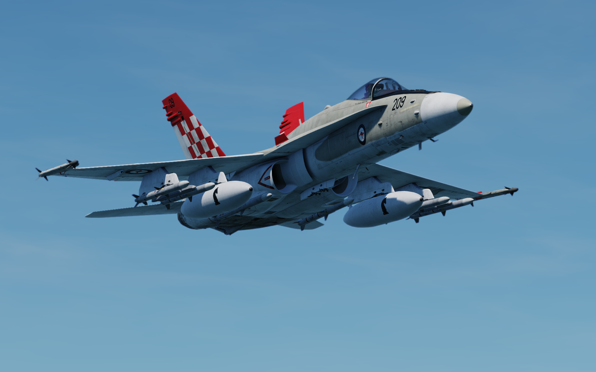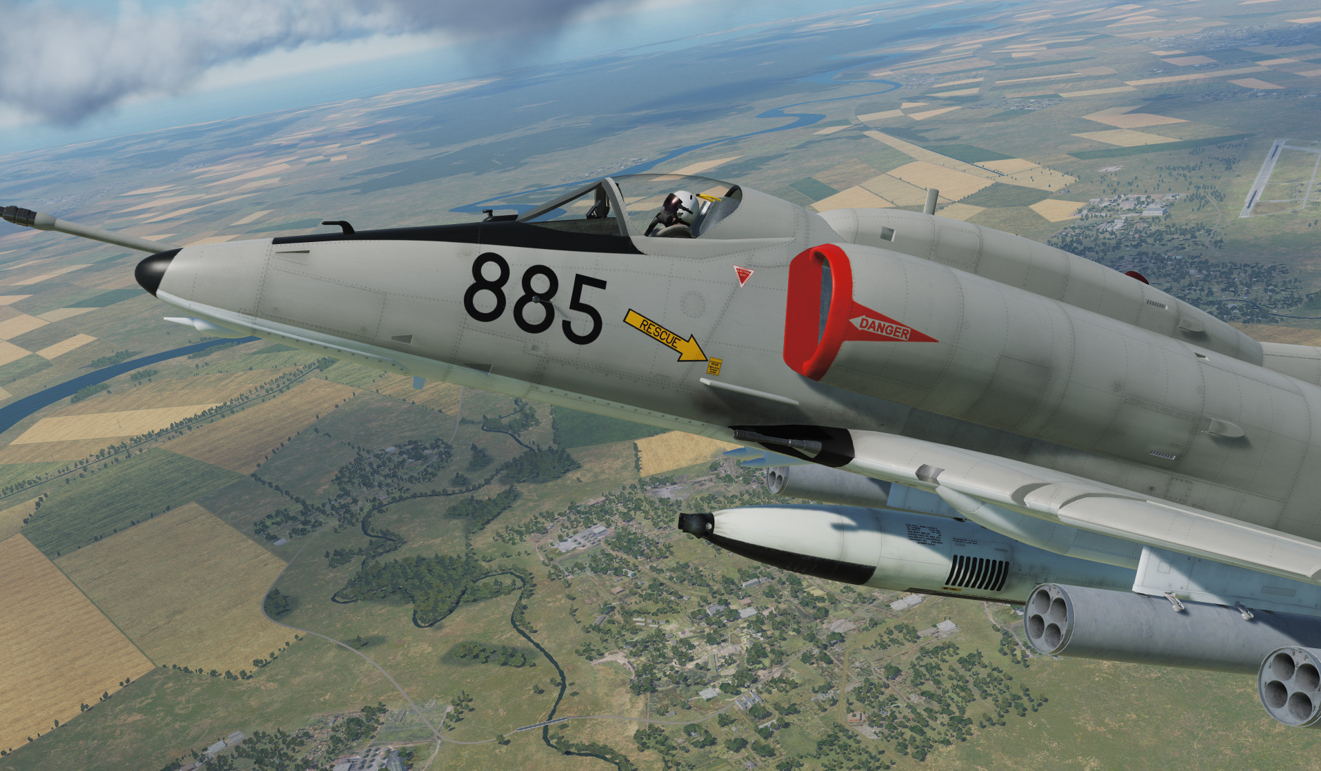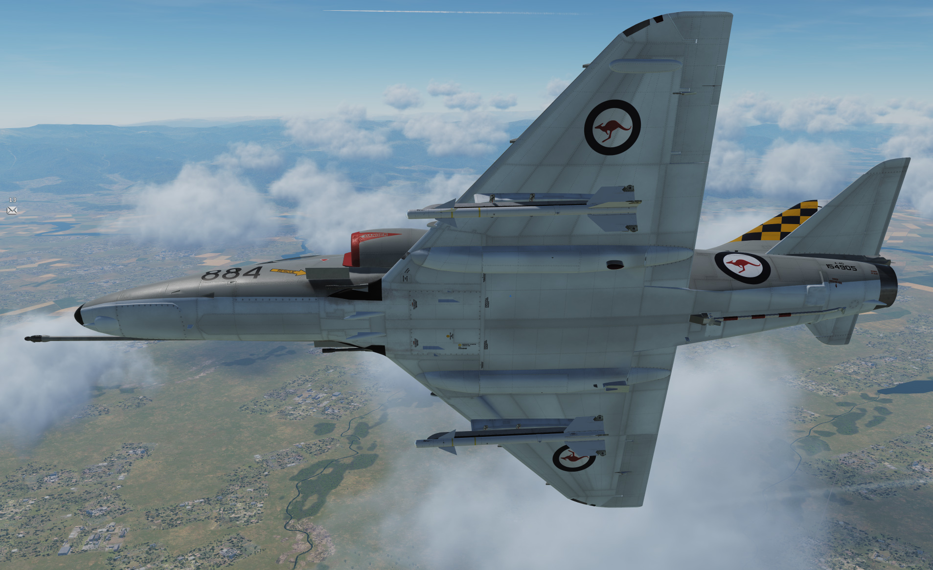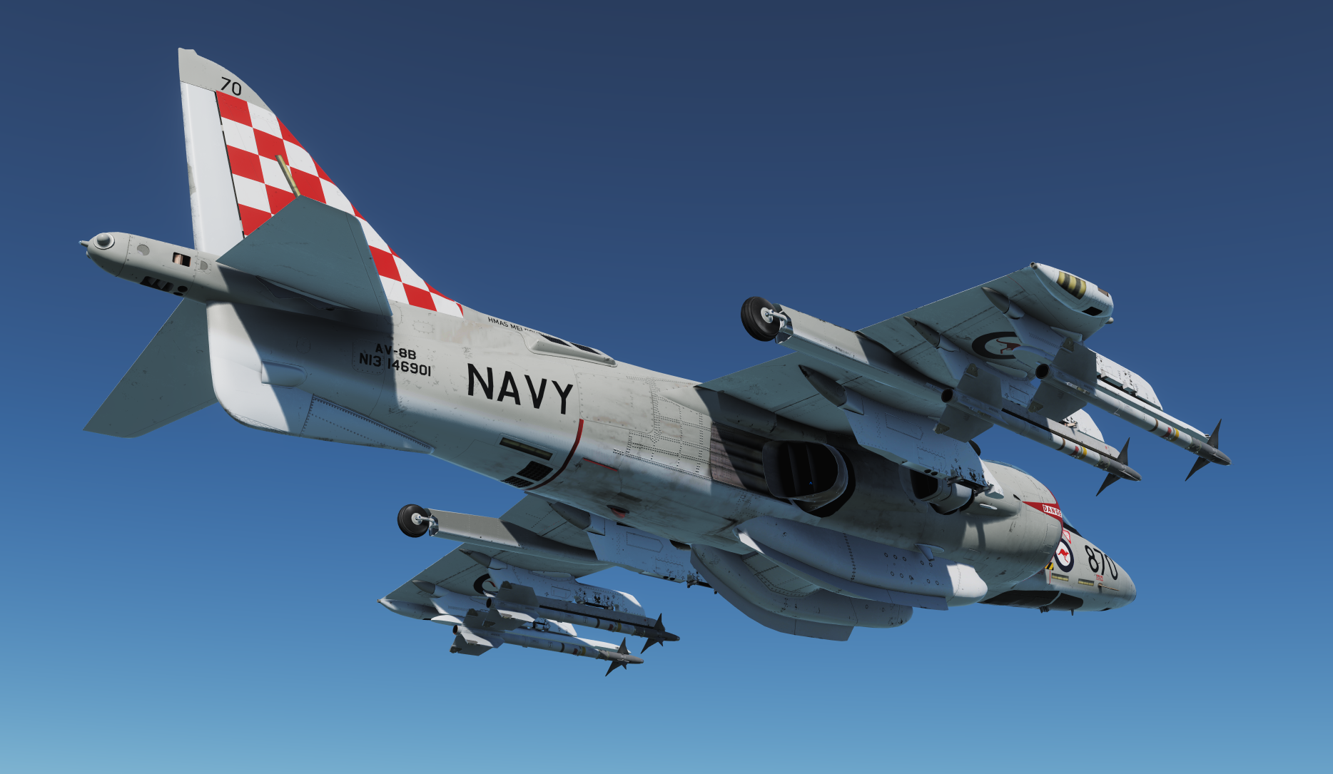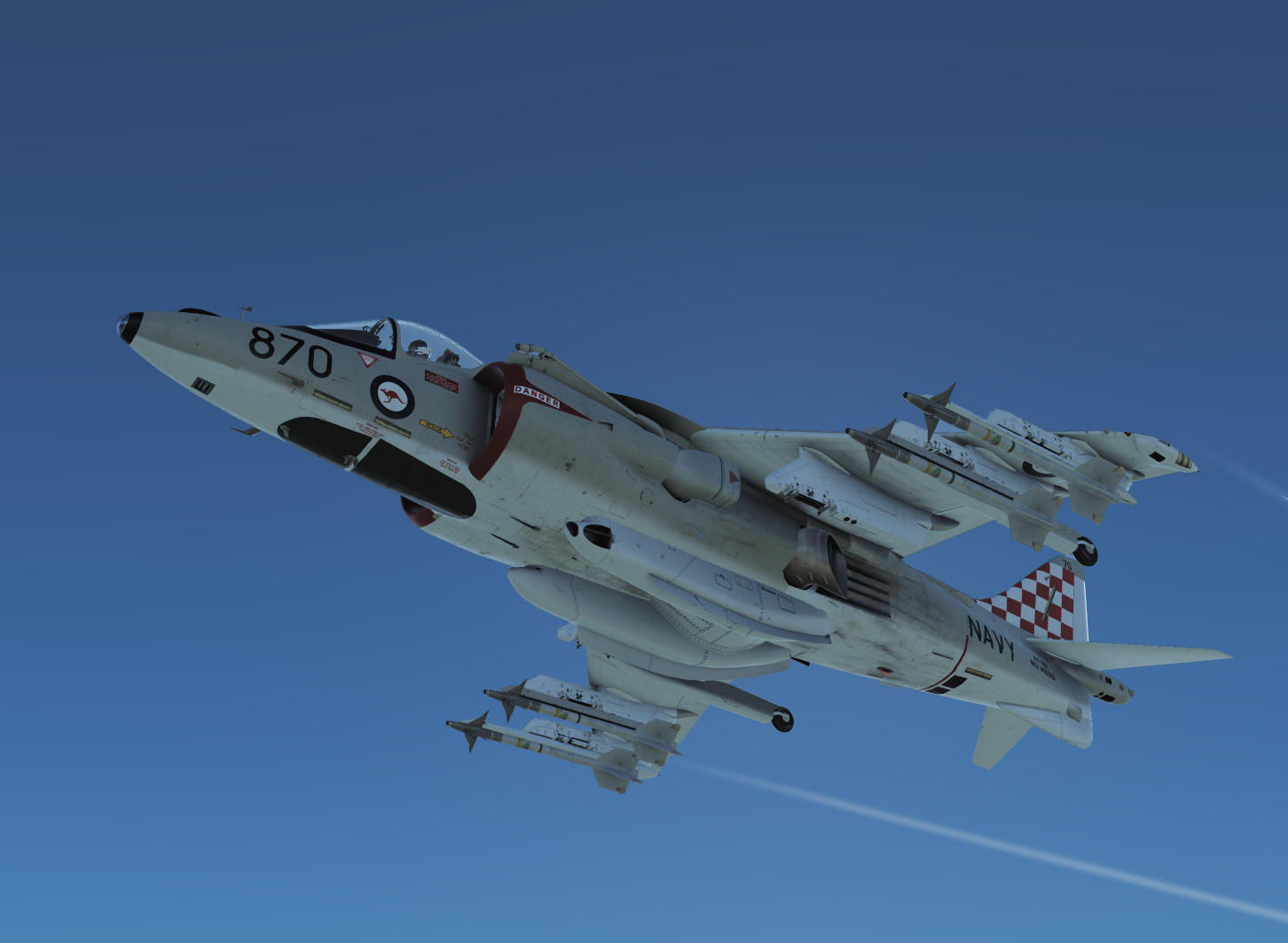 A fictional skin based on a blend of the Gull Grey/Insignia White hi-vis of the Royal Australian Navy VC-724 Squadron, and the US Navy of the 1970s, but with the hawk's head from the Brazilian Navy's AF-1 (A-4KU Skyhawk) and darker grey of the aircraft depicted here: