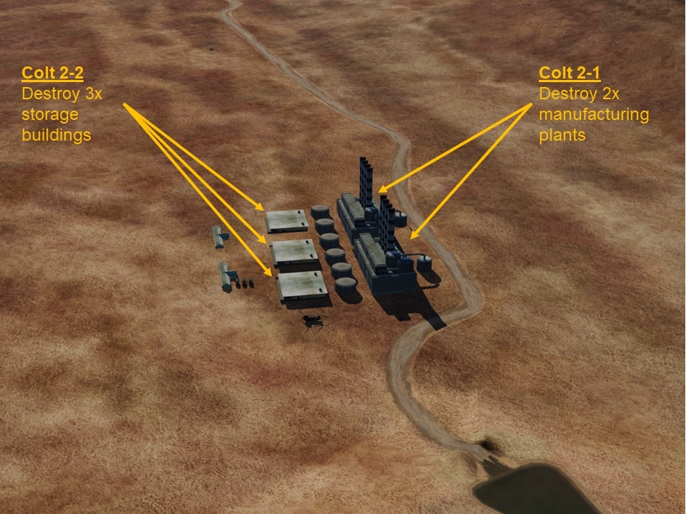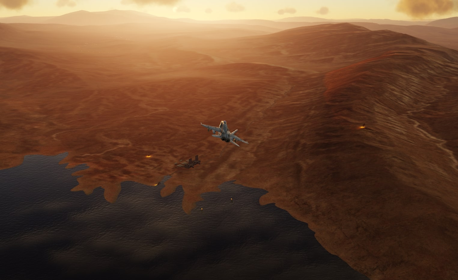 Destroy an Iranian weapons manufacturing plant and storage facilities.  Go in under cover of darkness with support from SEAD and CAP flights and hit the plant at daybreak.  “Overlord” will provide voiced updates and instructions as the mission progresses.    AWACS will keep you apprised of any bandits so you can focus on your targets and any ground-based threats.  Tankers are on station as well, and you will likely need to gas up to make it back to boat.