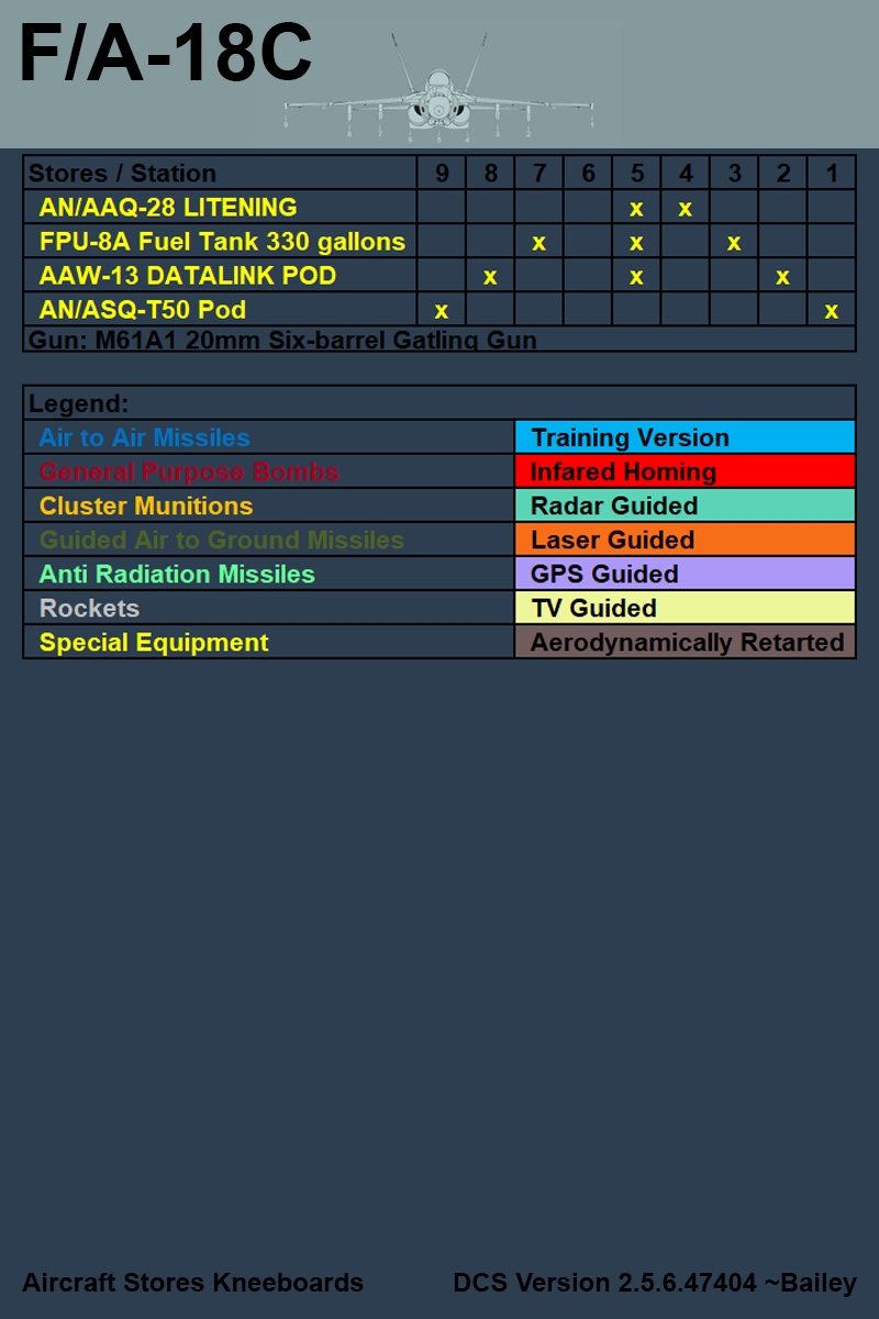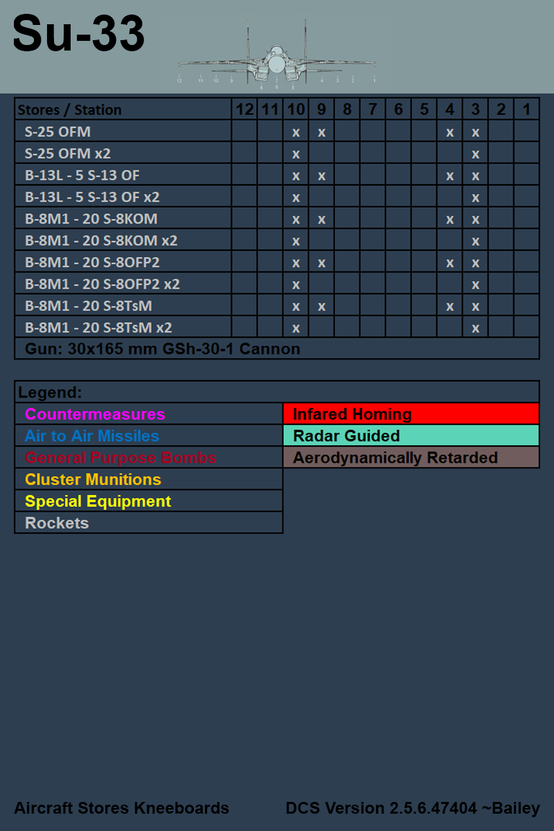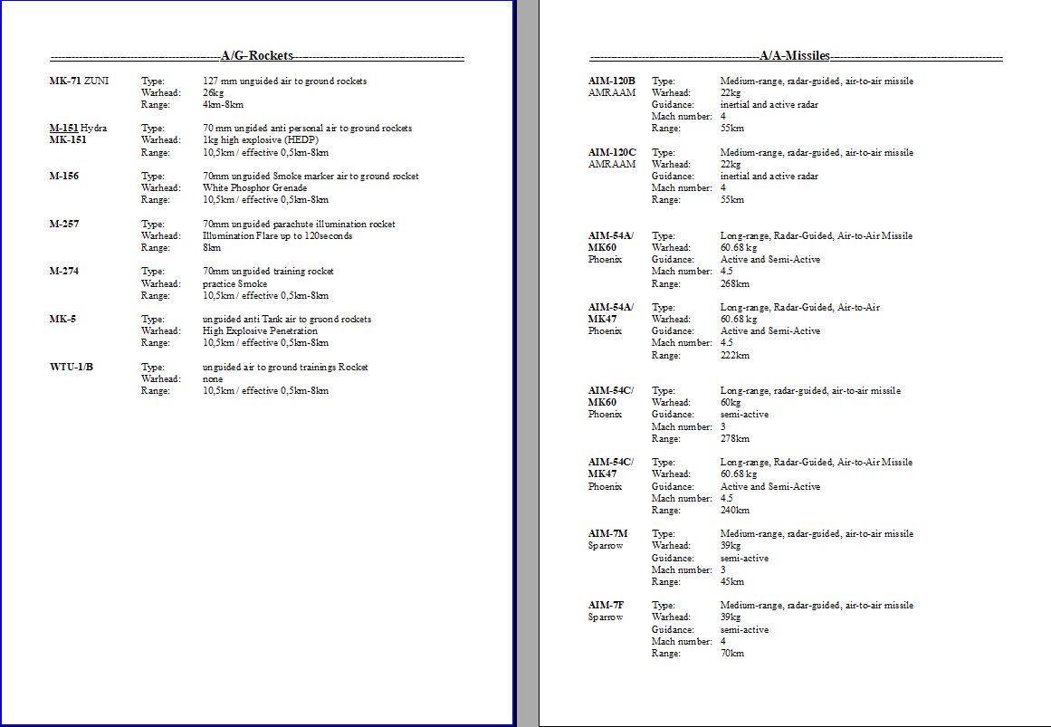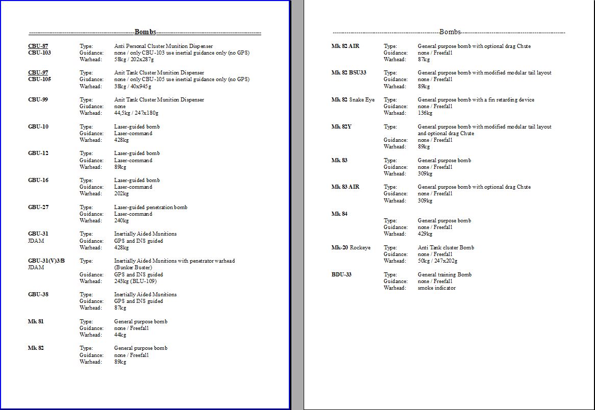 Have you ever wondered what the heck a Fabulous 250 was? Or maybe a Superfast 25 Obvious Fuel-Mobile? With these kneeboards you can find out! A FAB-250 is actually a general purpose bomb, not a plus size fashion model. A S-25OFM is a Unguided Rocket, not a European sports car. Use these kneeboards to plan your next loadout and jog your memory when you forget what a Punch Through A Balloon 2.5 Knock Out really is. (Hint: PTAB-2.5KO.) Have Fun! Current stores kneeboards include AV-8B Harrier, F14, F16, F18, Mi-8, Su27, Su33, A-4E-C, MB-339A, JF-17, AJS37 Viggen, A-10C, A-10C2, MiG-29G, MiG-29A, and MiG-29S. If you want to see more aircraft, just ask!