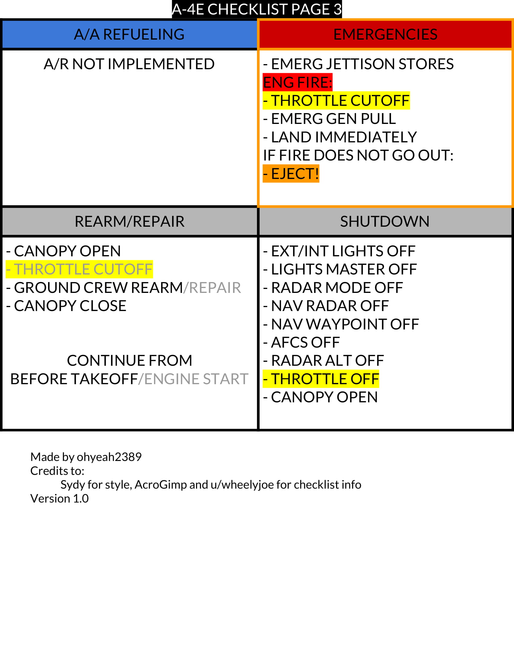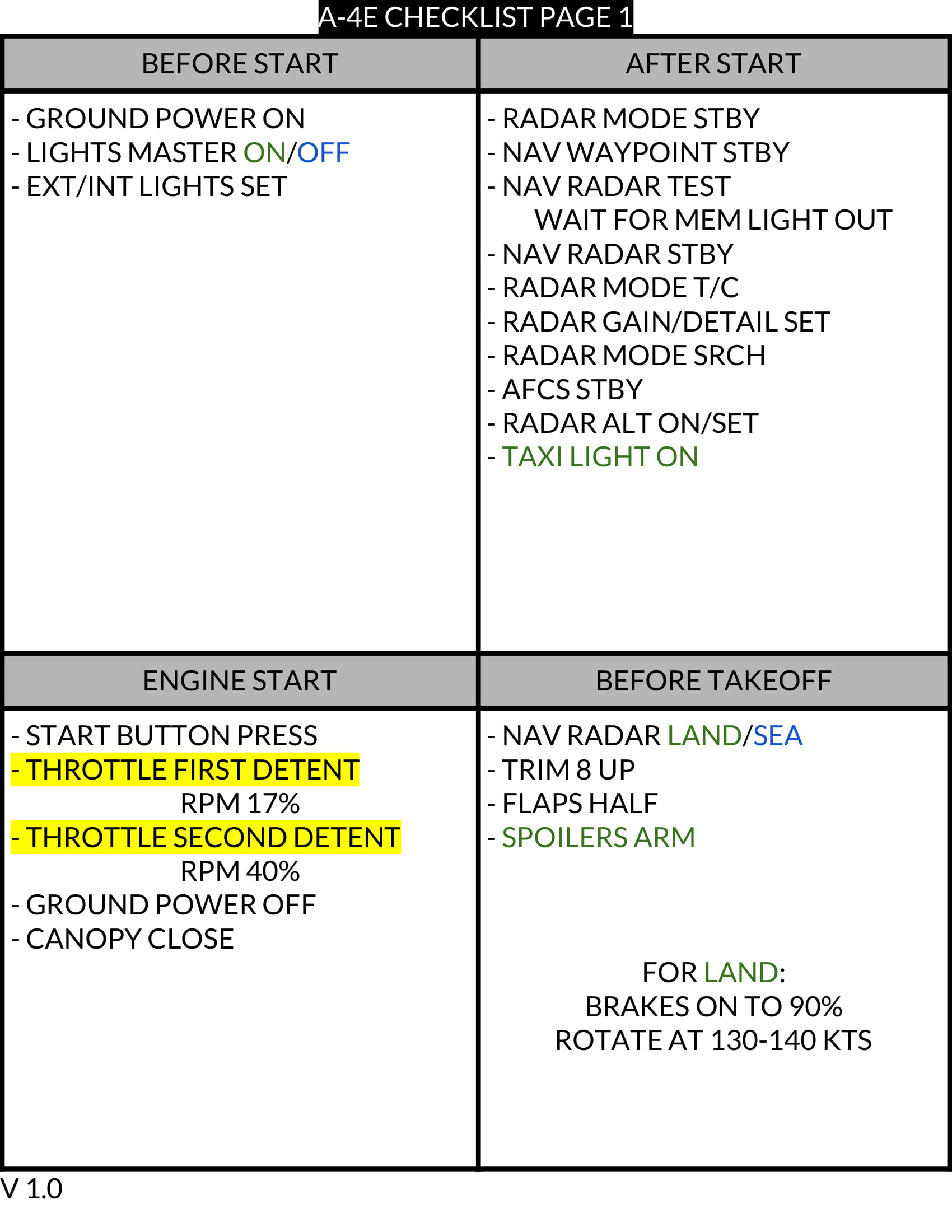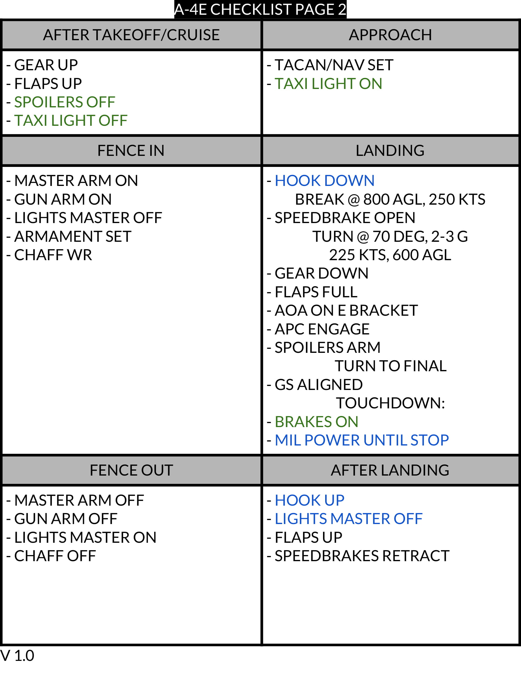 This is an enhanced checklist for the A-4E Skyhawk. It includes optimized startup, takeoff, cruise, fence in/out, refueling, approach, and landing checklists.