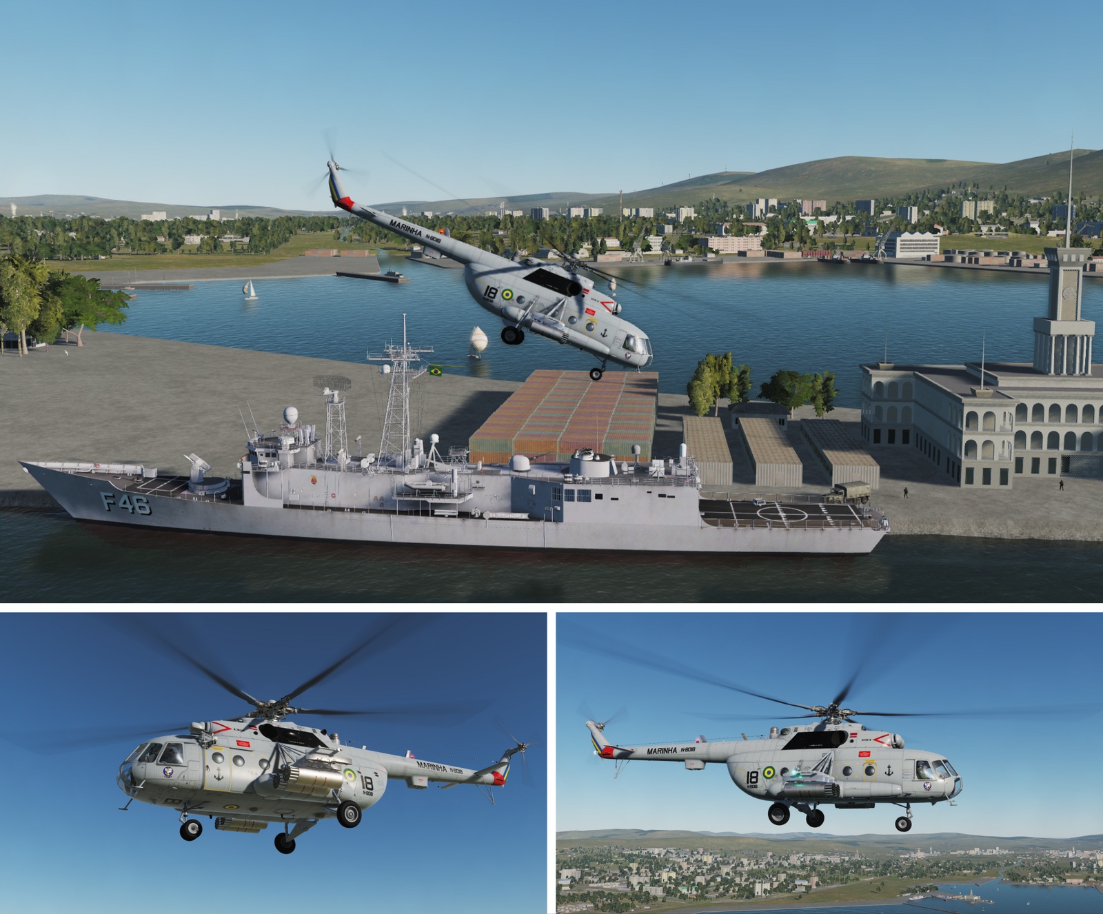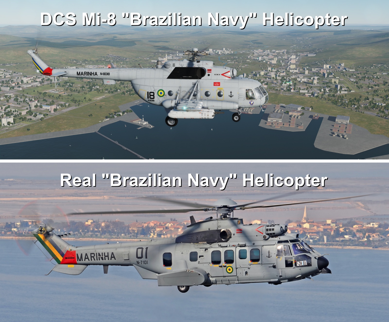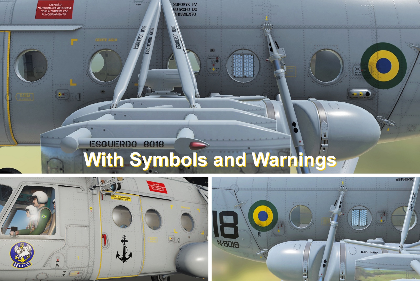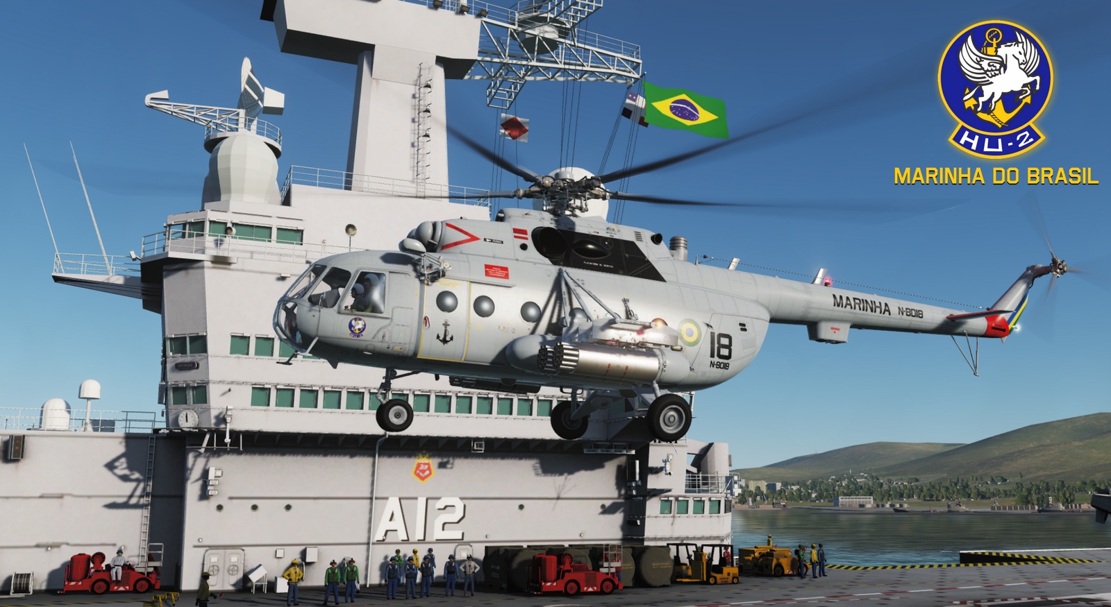 This is a fictional Mi-8 skin texture of the "Esqd HU-2" ( 2nd General Employment Helicopter Squadron ) of Brazilian Navy ( Marinha do Brasil ), it was inspired by the real painting of the old Sikorsky S-61 ( SH-3 ) helicopters of Brazilian Navy, but also on the new Eurocopter EC-725. Although Brazil uses some Mi-171 helicopters, they are not used by brazilian military forces.