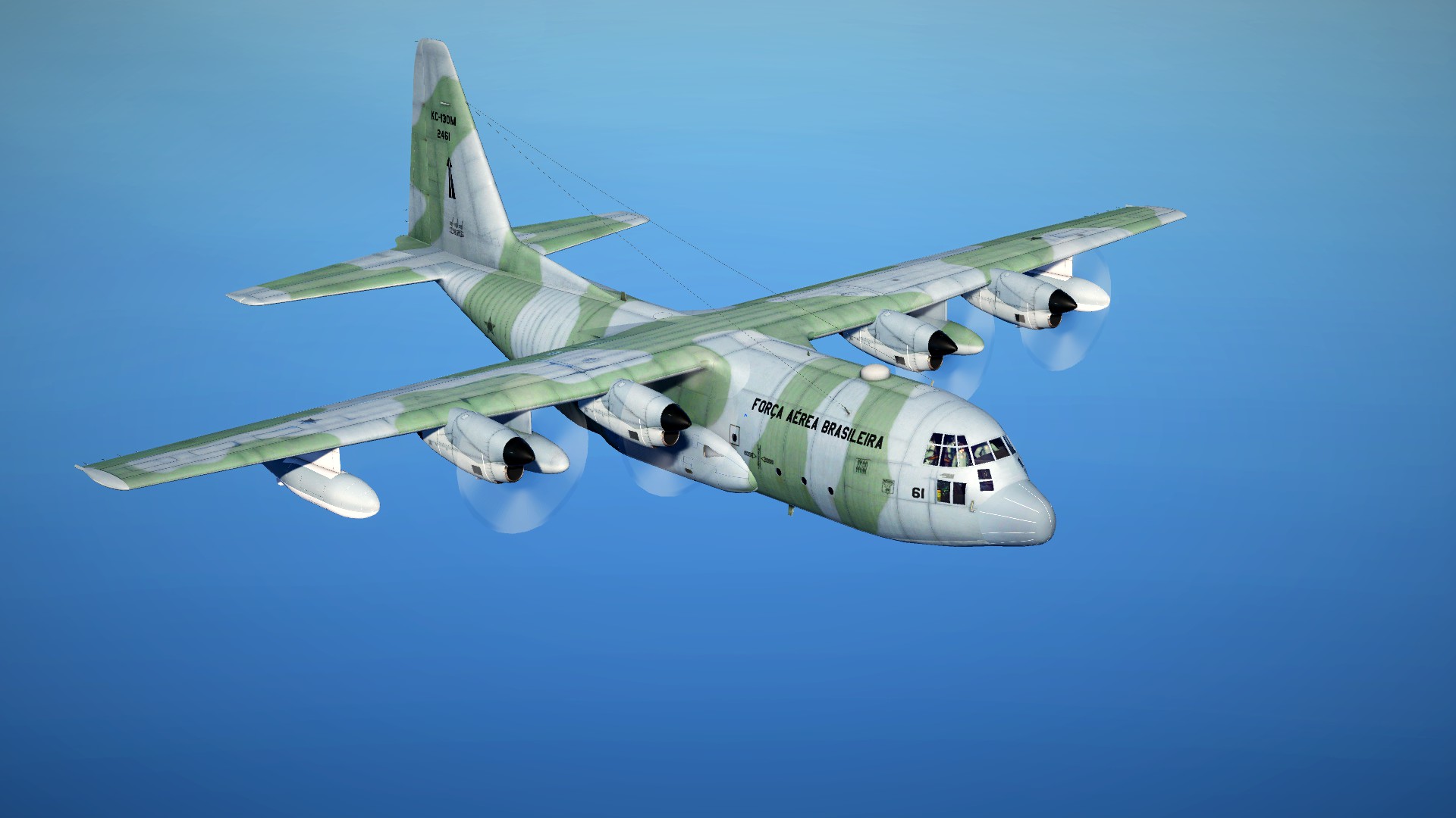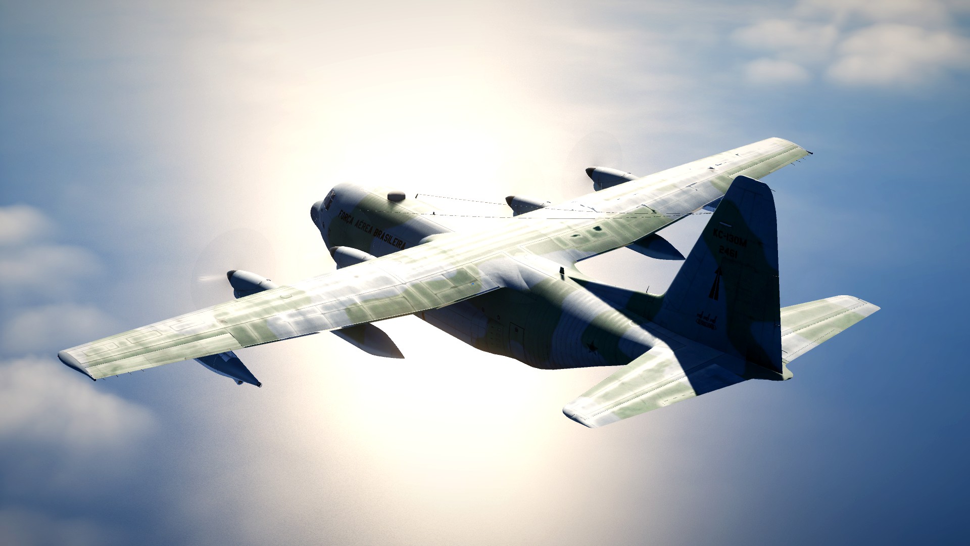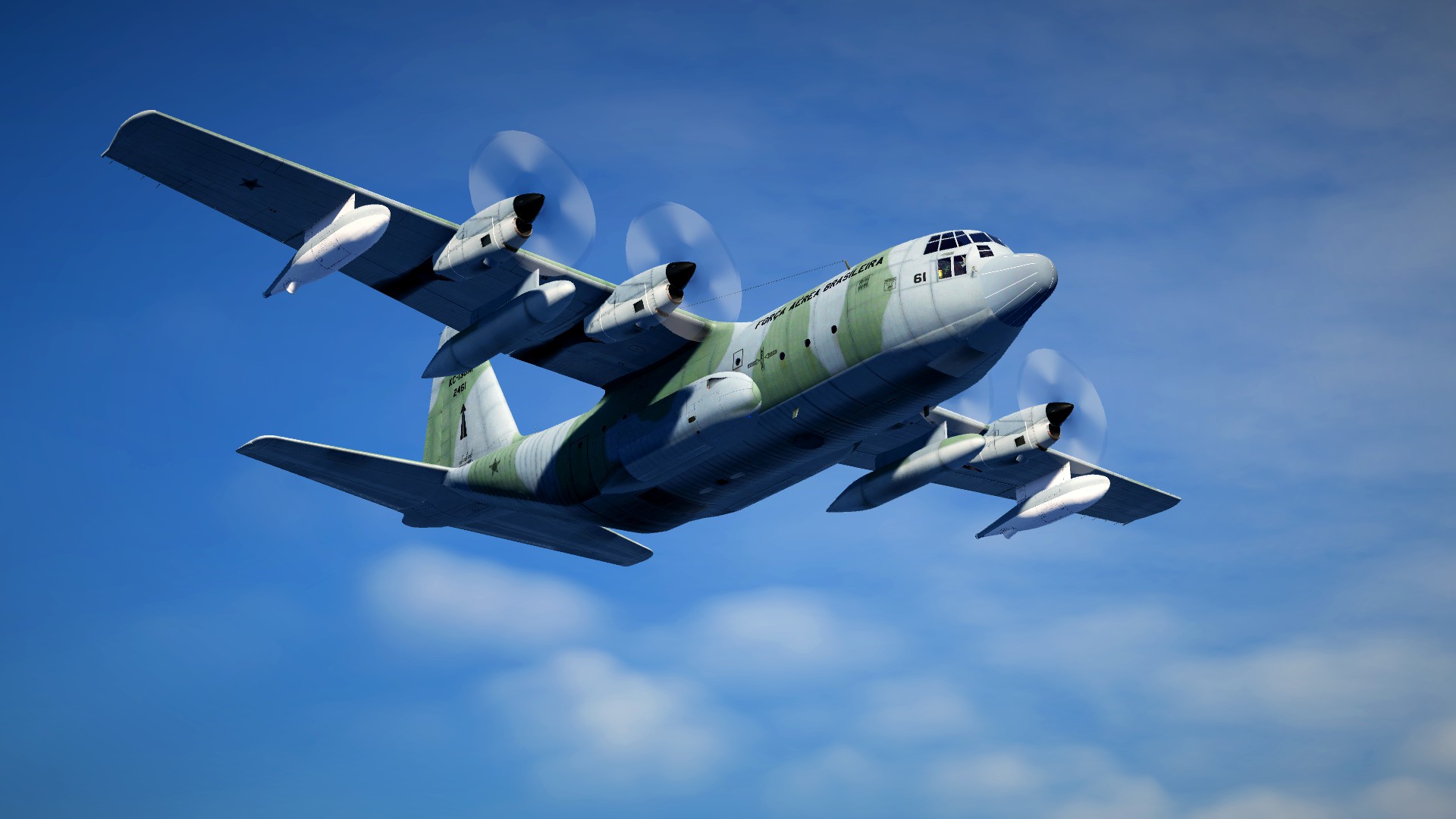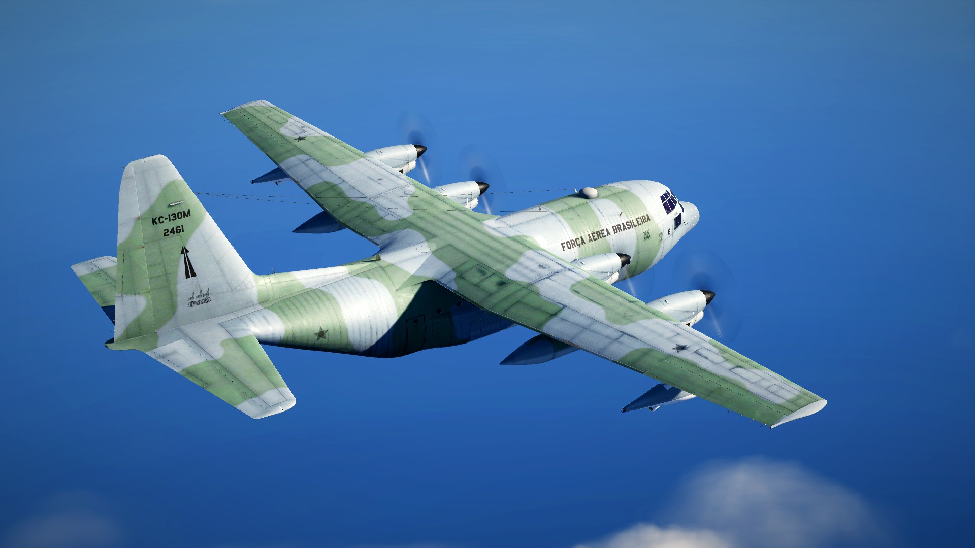 Brazilian Air Force KC-130 Skin for the default KC-130, based on FAB 2461. Was impossible for me to reproduce the green camouflage with perfection since there is no paintkit available. I just took the french paint as reference and applied a filter to change the green tone. Works with the default KC-130.