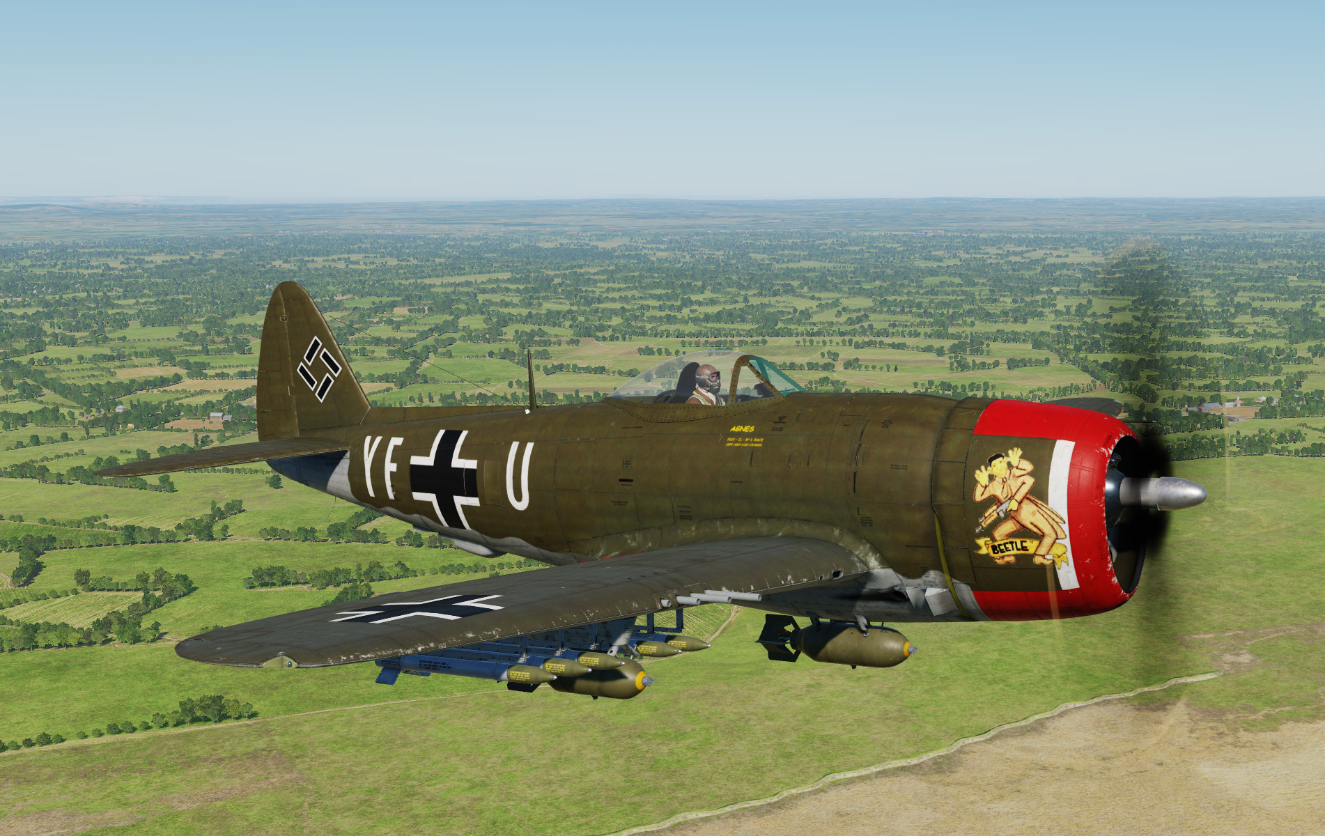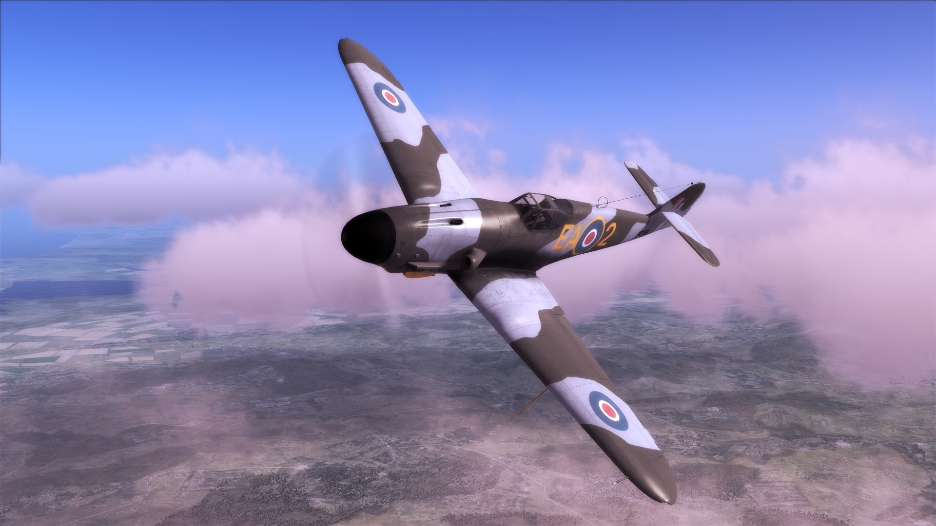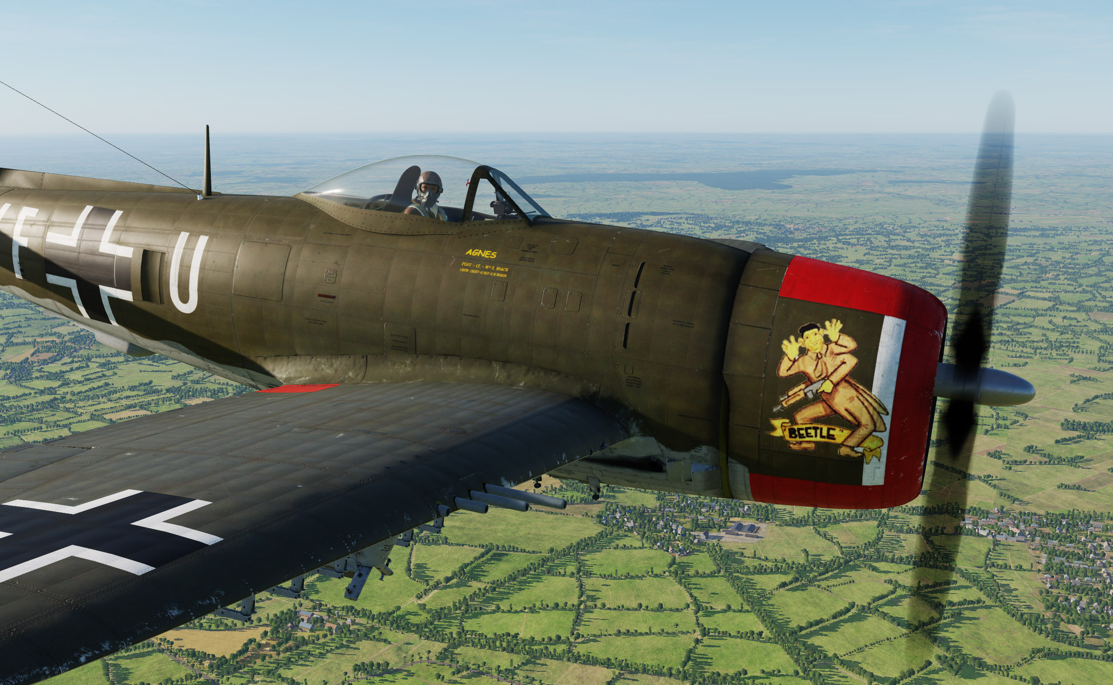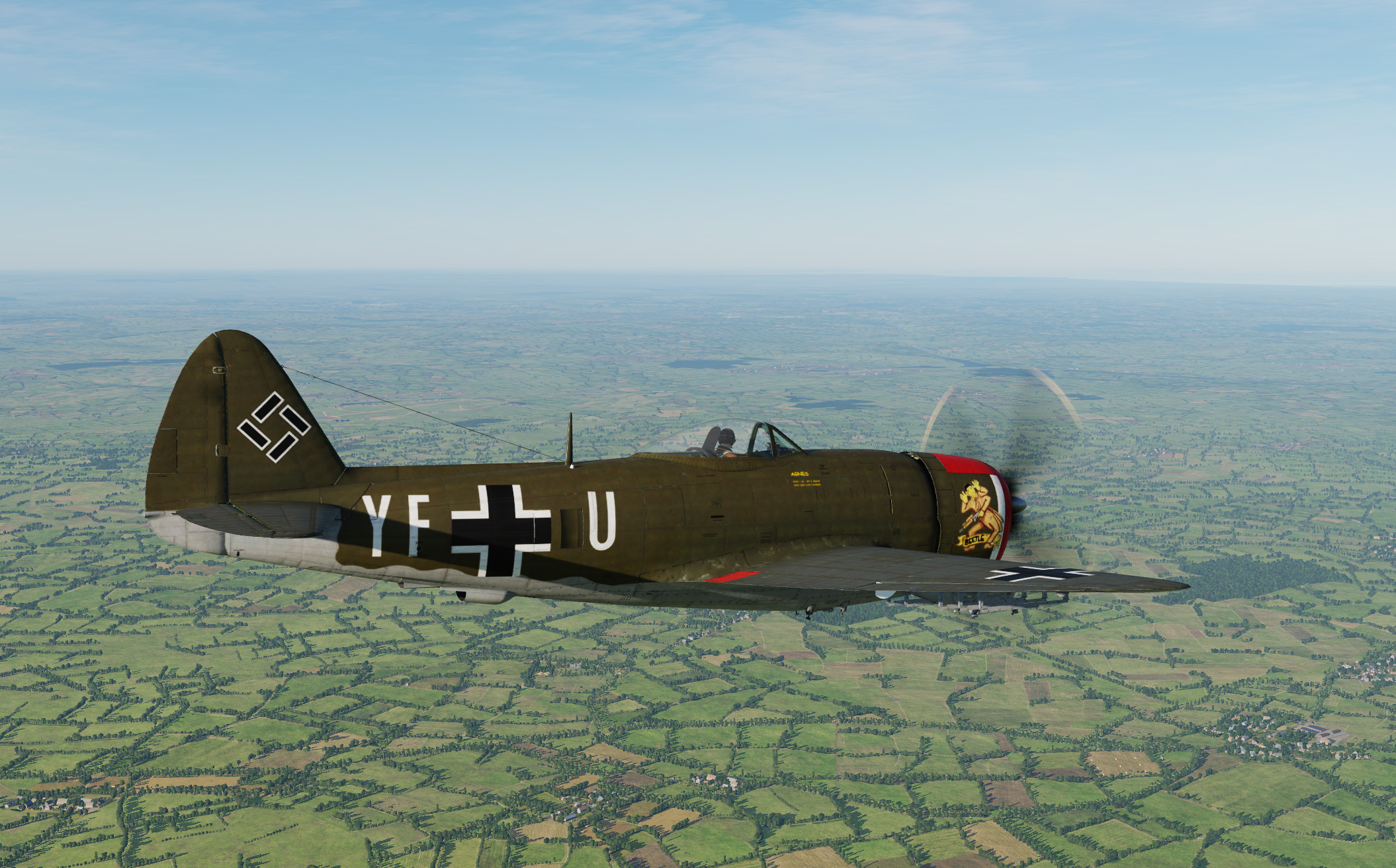 A Royal Air Force FW190 A-8 skin based on captured FW190 PE882 of No. 1426 Flight Royal Air Force, in early war dark earth camo (later war ocean grey camo skin is included in the module).