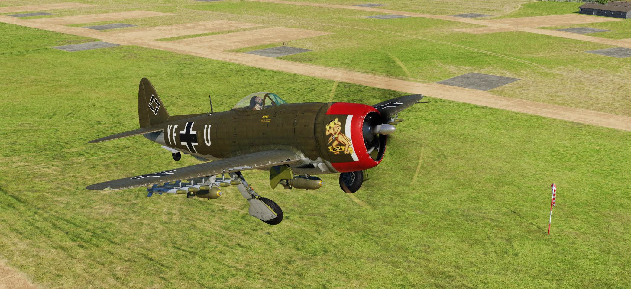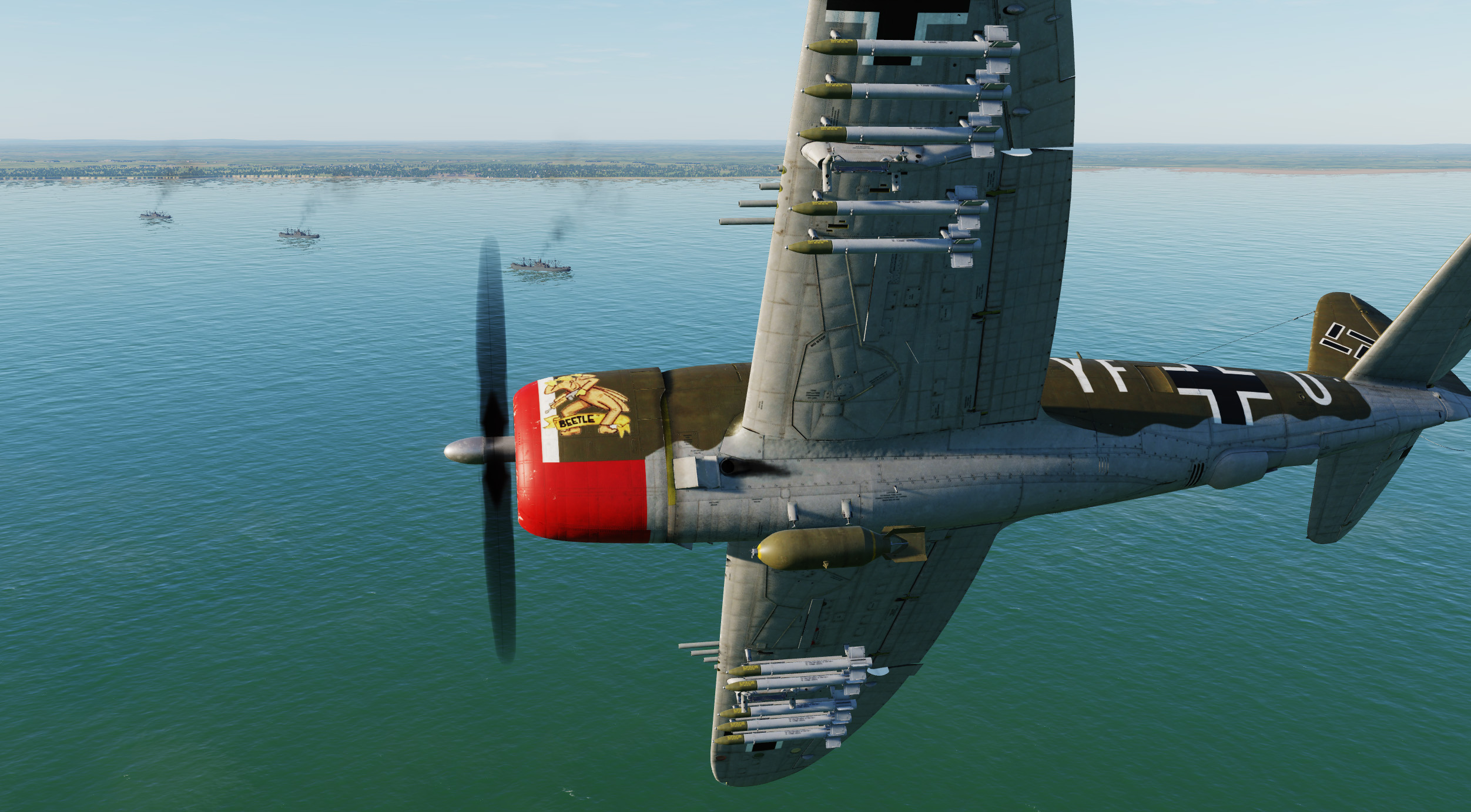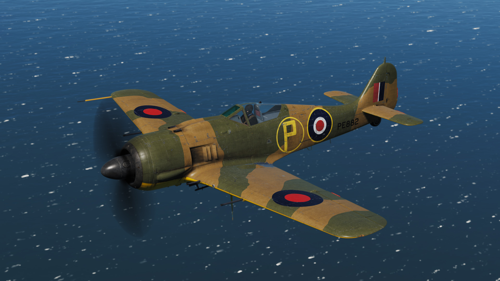 A Royal Air Force FW190 A-8 skin based on captured FW190 PE882 of No. 1426 Flight Royal Air Force, in early war dark earth camo (later war ocean grey camo skin is included in the module).