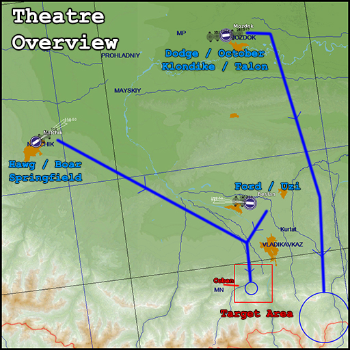 For all Aircraft- Russia and North Korea have joined forces, To take full control of Georgia. Calling there full military forces into Georgia Overnight to hit us hard by Air, Land and Sea Russia has sent the full might of there carrier group north in support of there ground forces, and set up a Blockade at our weapons testing and storage facility in Gelendzik. We Have been pushed back to Anapa, our last holding point and headquarters for Georgia., Carrier group umbrella are currently docked and in repair and can only provide limited sam capability, 2 F18s, 1 E2C Hawkeye, 1 S3B Refueller. We are down to our last EWR station Lima Mike 22 who can provide us with any warning of incoming forces, Also 1 E3A Support. Carrier group Prometheus are on route to give us support and should arrive in time to start our counter attack, Once we have taken Gelendzik, and de