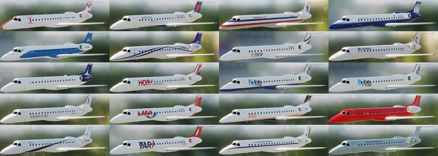 This pack contains 21x ERJ-145 and 24x ERJ-135BJ liveries.