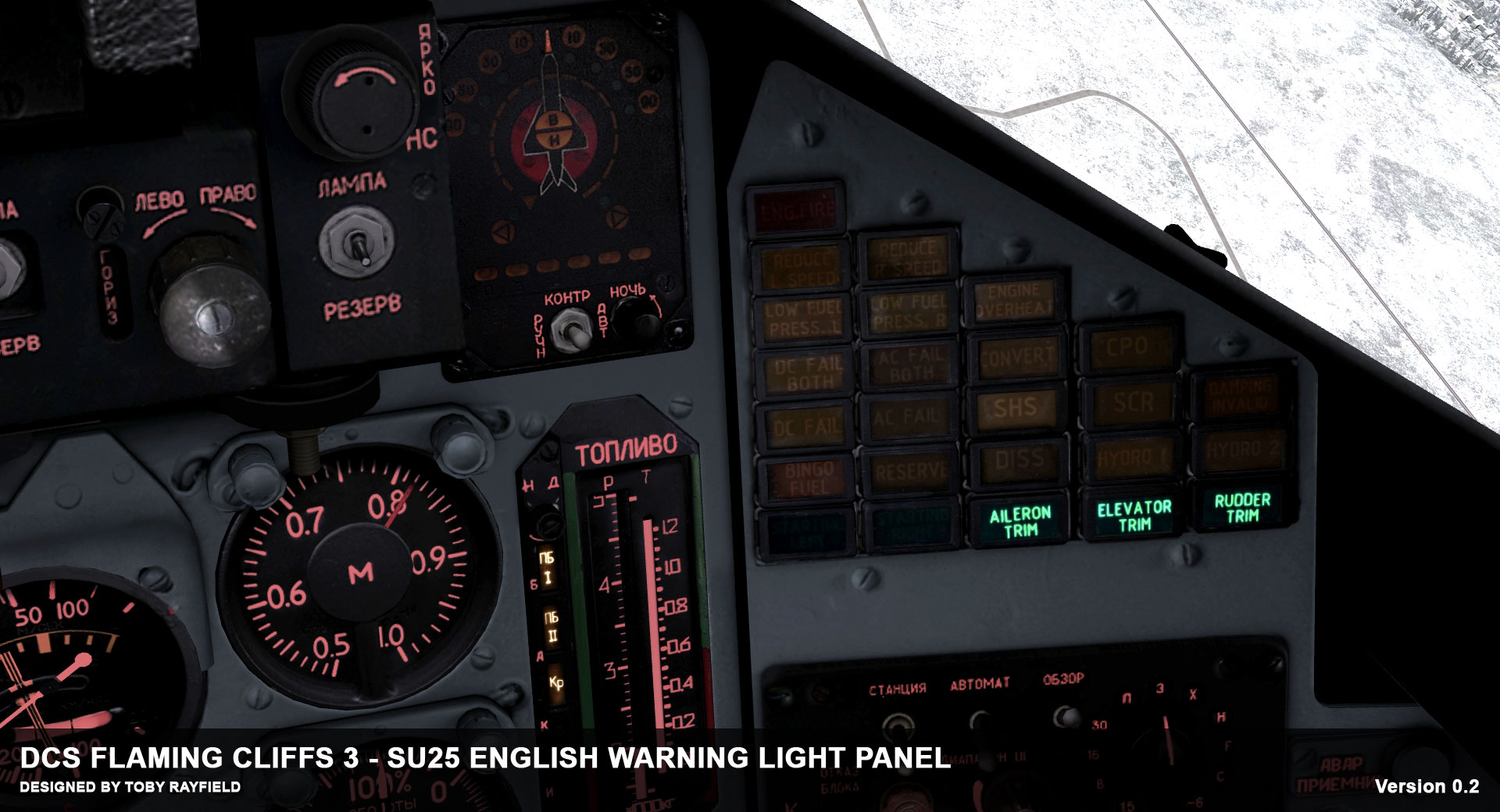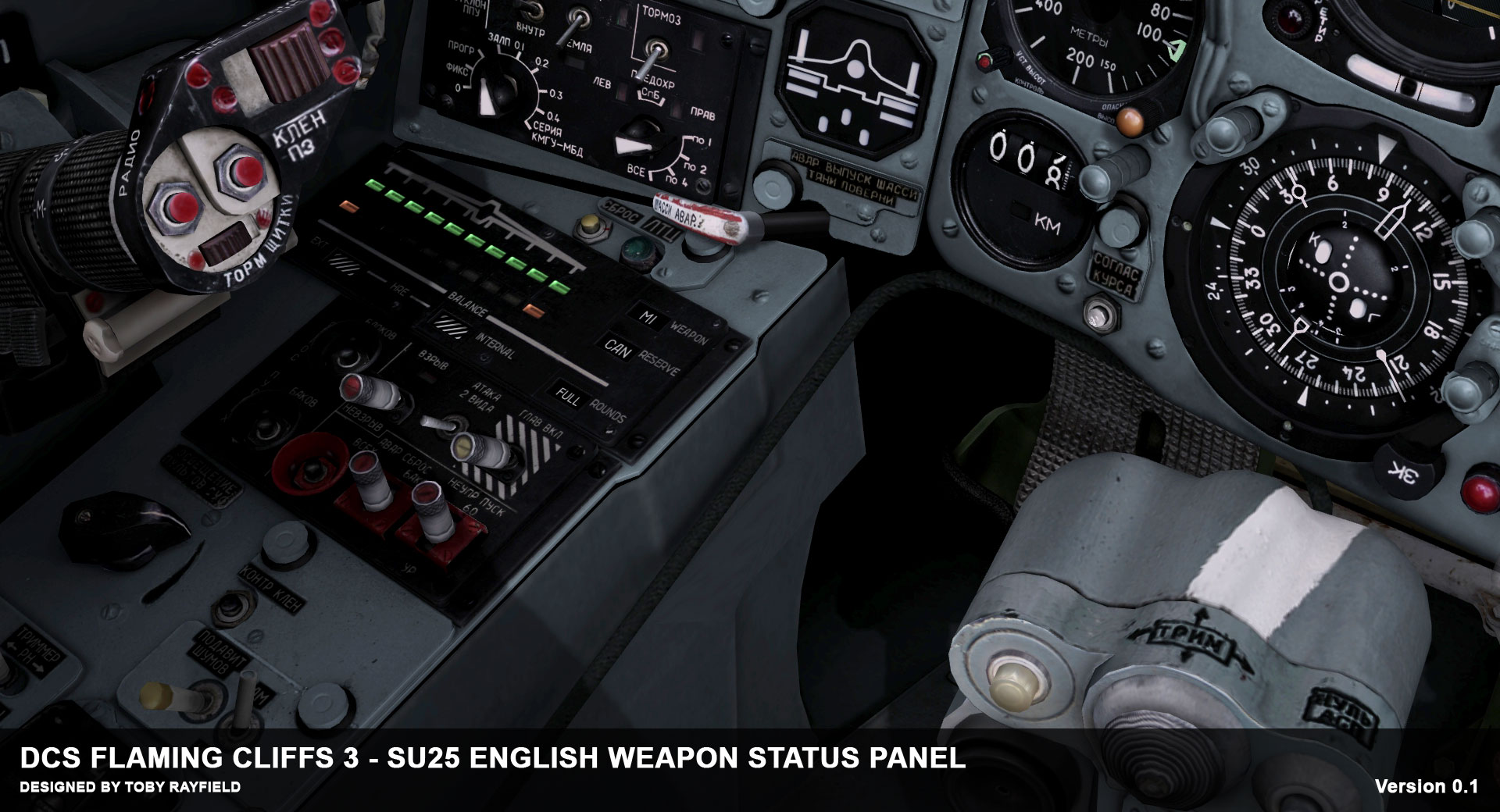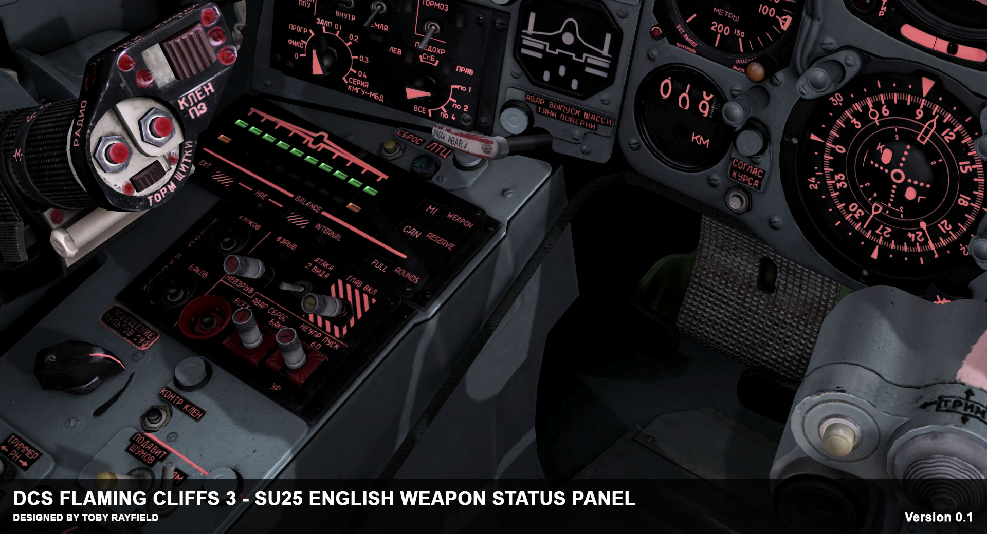 This texture mod replaces the Russian text on the weapon status panel and the warning lights on the SU25 with English abbreviations.