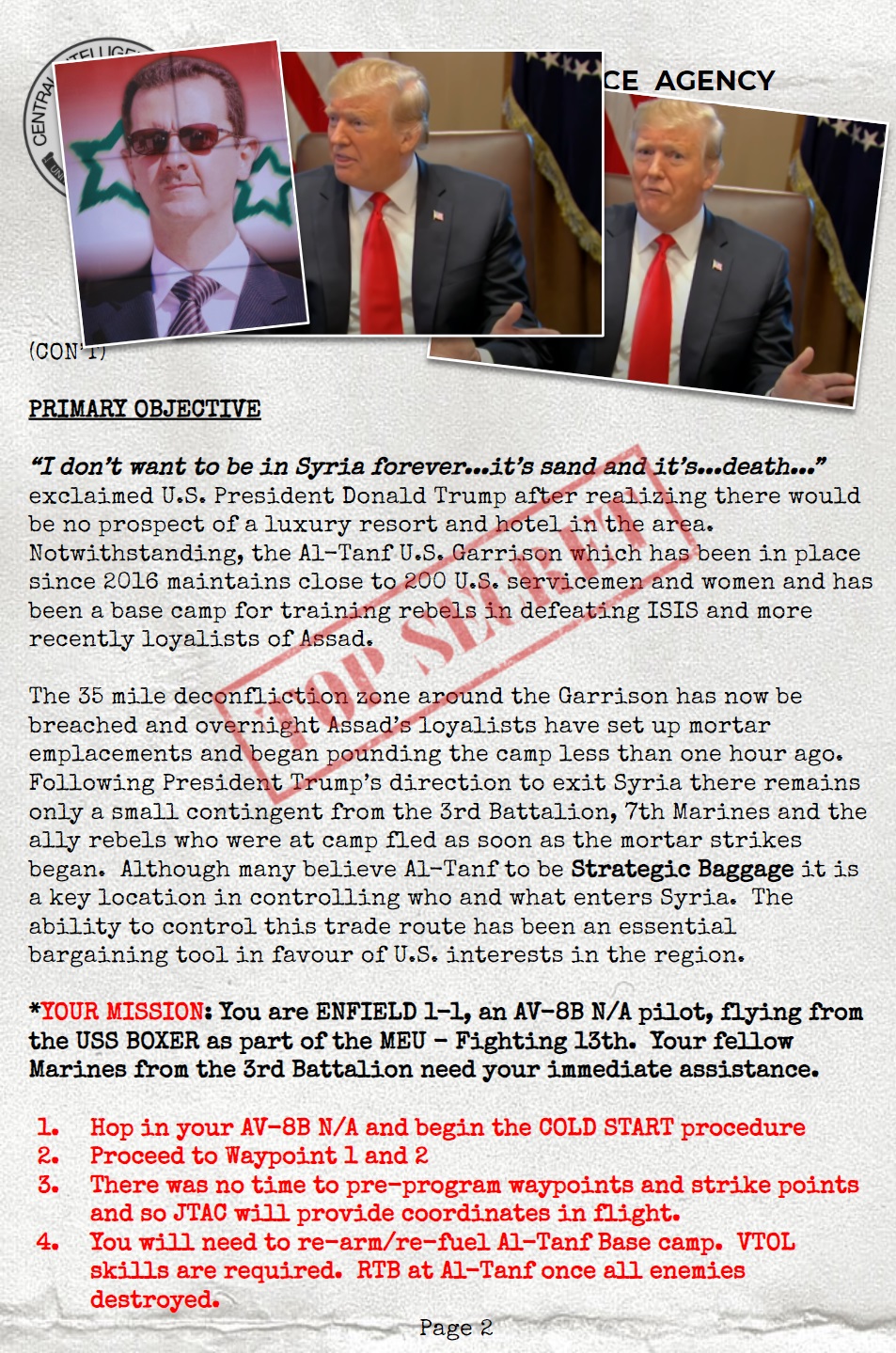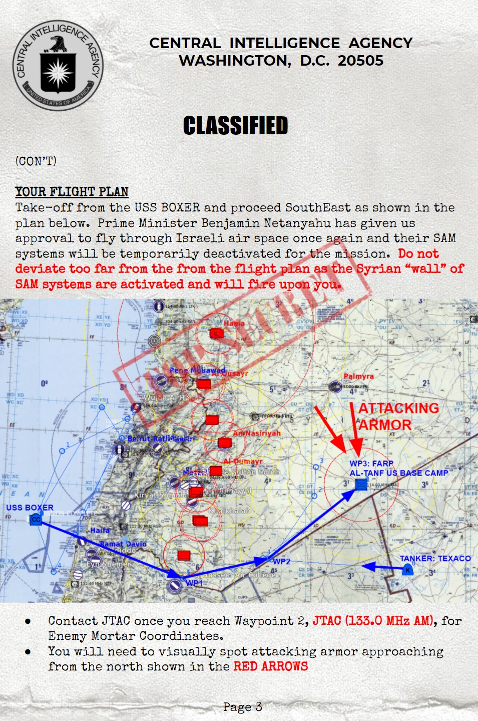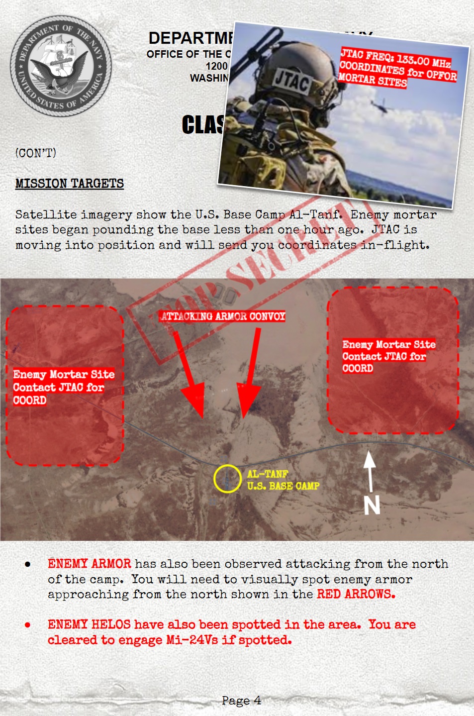YOUR MISSION will be to scramble to take-off and provide CAS support as JTAC on the ground will be providing coordinates for enemy positions attacking the camp...but be on alert as Russian Mi-24vs have been spotted in the skies...