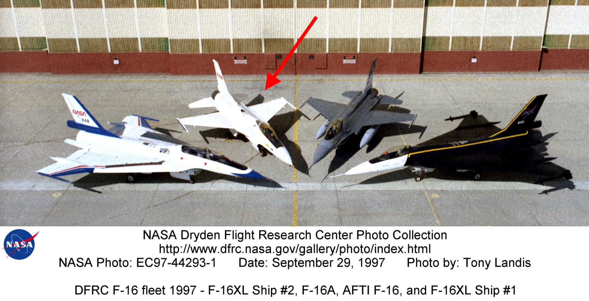 This General Dynamics F-16A was used by NASA Dryden Flight Research Center as an accompanying aircraft for testing the one and two-seater F-16XL and later as a test vehicle in the AFTI program (Advanced Fighter Technology Integration) at the DFRC. It is the only F-16 (serial no. 82-0976) with civil registration N826NA. Previously, this F-16A was used by the Langley Research Center with the identifier N516NA. The vertical tail of the A version was replaced by a C / D vertical tail during use.
