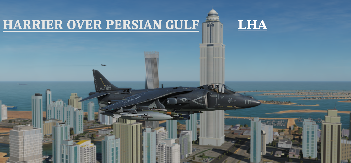 Harrier over Persian Gulf using Mbot Dynamic Campaign Engine modified by Miguel21. Fly the AV-8B in an immersive dynamic system which will record your destructions and losses. Each mission will be different with  STRIKE, of many kinds of targets Your Fleet will support you with Tankers, AWACS and many allied fighters and bombers