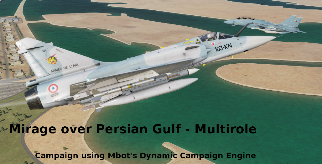 Mirage over Persian Gulf using Mbot Dynamic Campaign Engine modified by Miguel21. Fly the Mirage 2000C in an immersive dynamic system which will record your destructions and losses. Each mission will be different with CAP, STRIKE, ESCORT, INTERCEPTIONS, etc... Your Fleet will support you with Tankers, AWACS and many allied fighters and bombers.