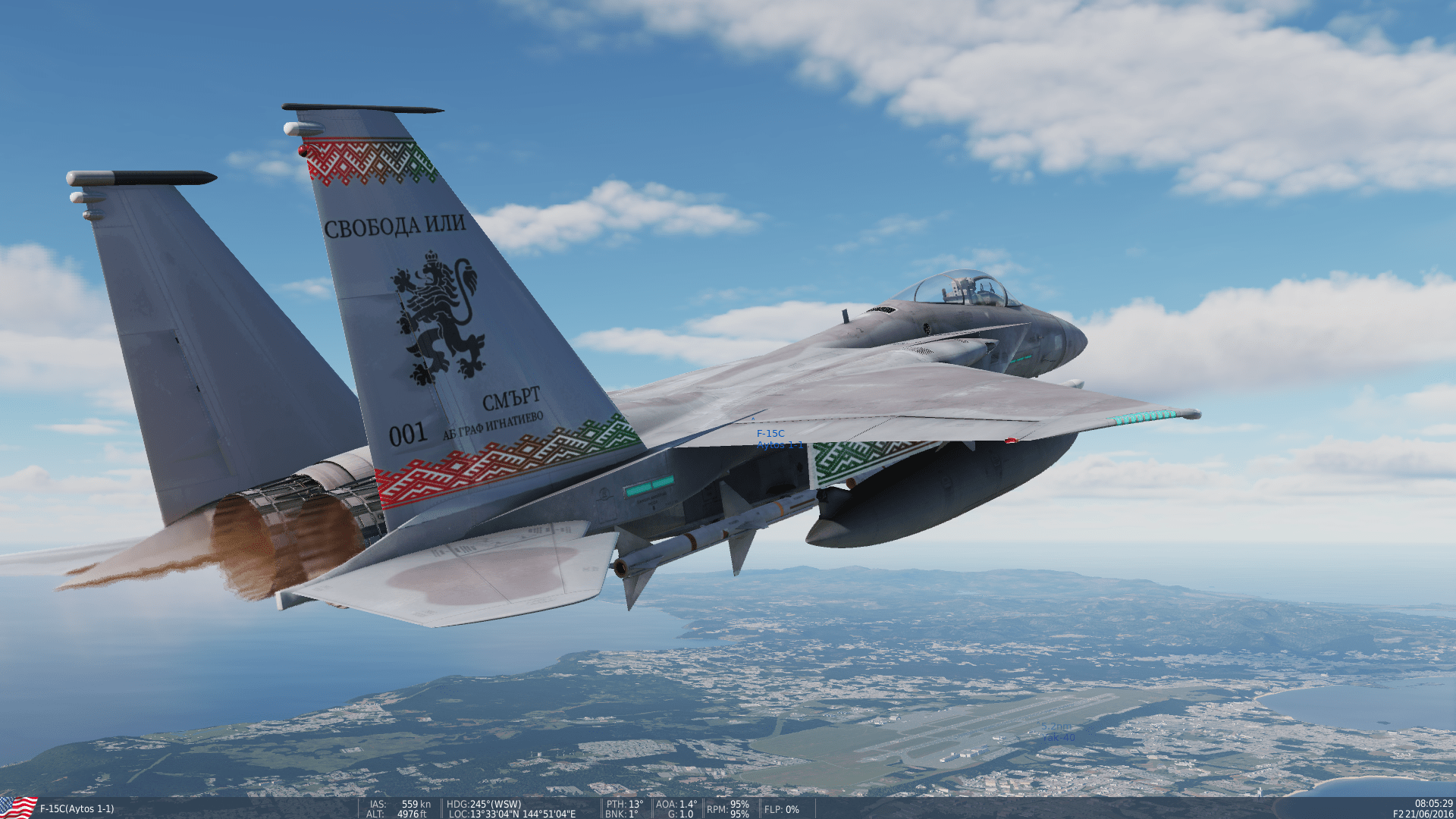 Skin, representing a BAF F15C, tact. number 001 with the tag Aerobase Graf Ignatievo. It also includes the Bulgarian air force roundel and text saying "Liberty or Death". Also in the bundle, the lion of the Bulgarian coat of arms is added as well as the national ornament pattern.