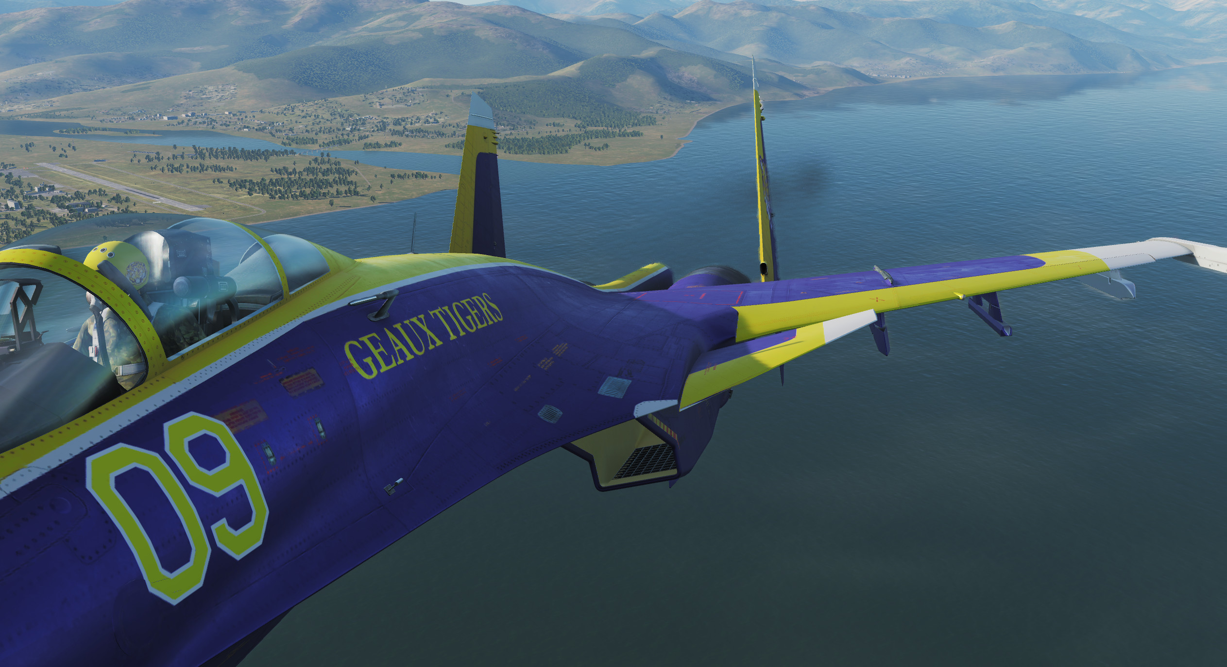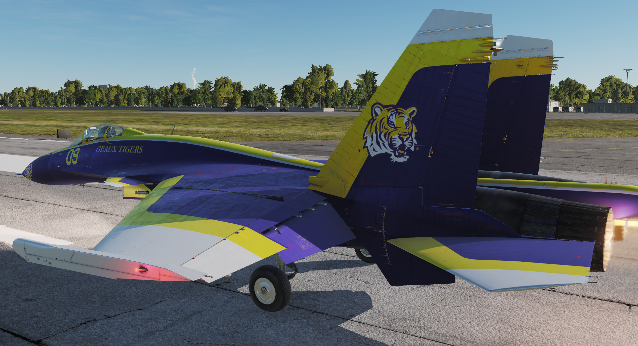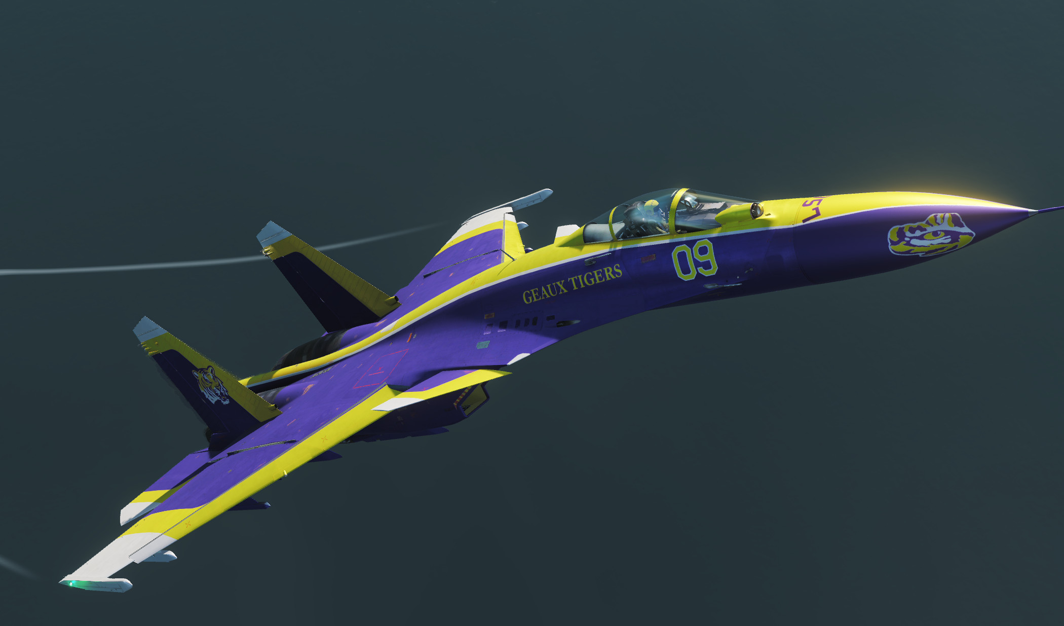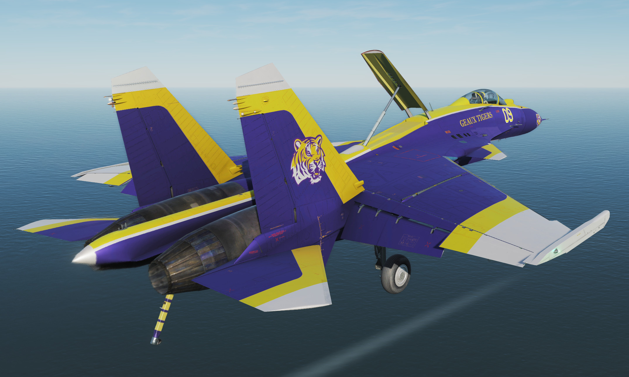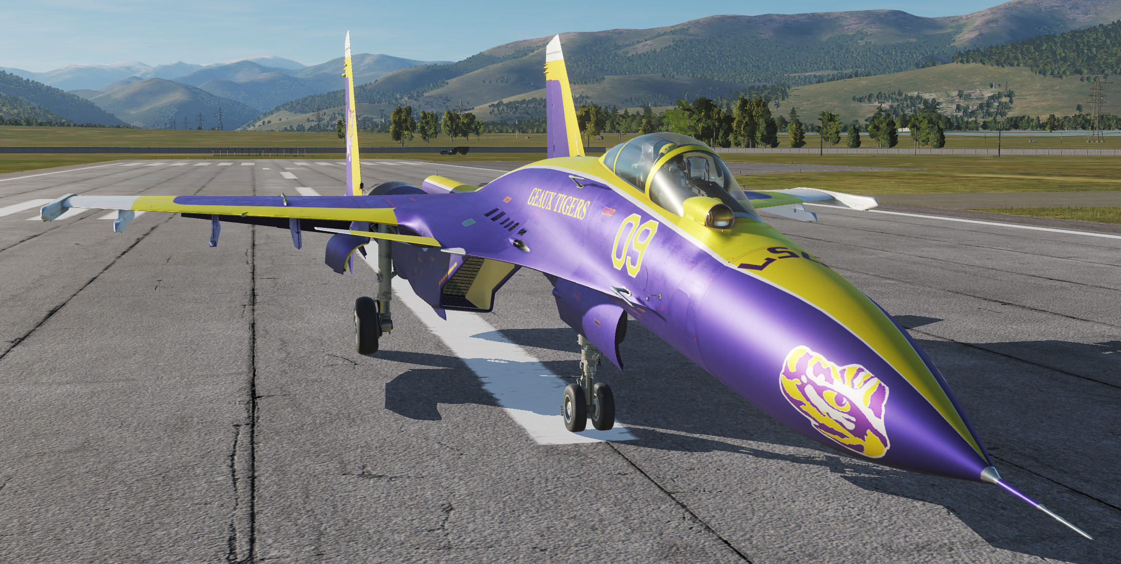 This Su33 skin is based on the uniform, logo and field of the LSU (Louisiana State University) 2019 National Champion college football team.  Included are both a clean airshow and dirty combat version of the paint scheme.  This skin is based on their alternate purple uniforms.  I've also created a version for the F/A 18-C Lot 20 Hornet based on their usual white uniforms, you can find that one by searching for "LSU Tiger Hornet".  Geaux Tigers!