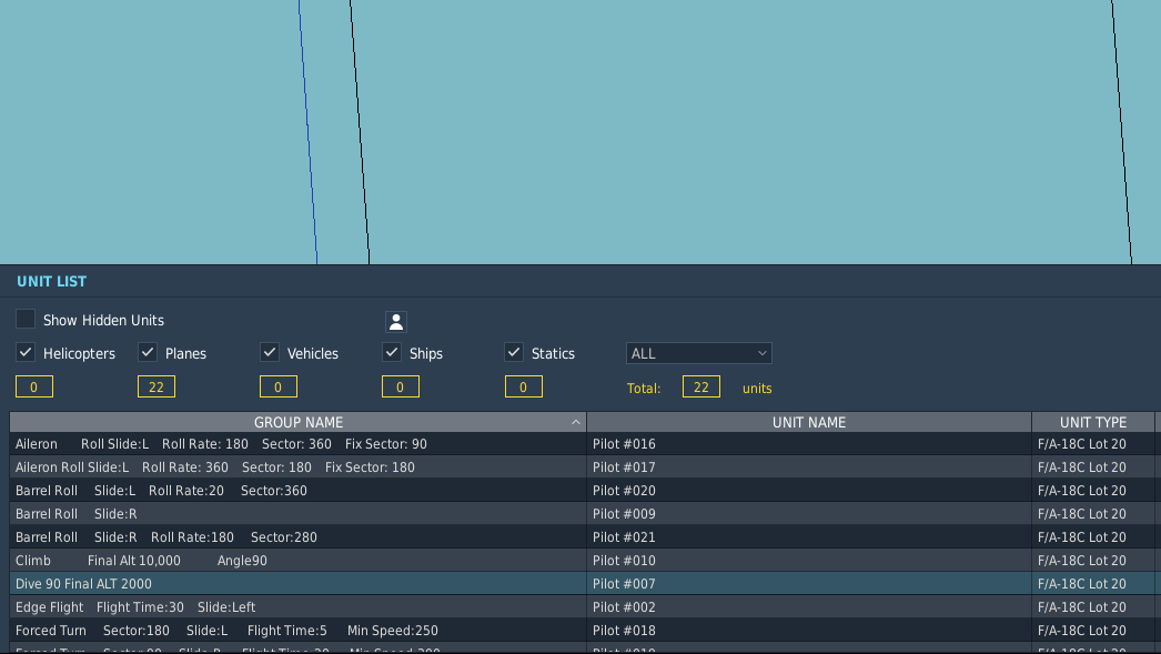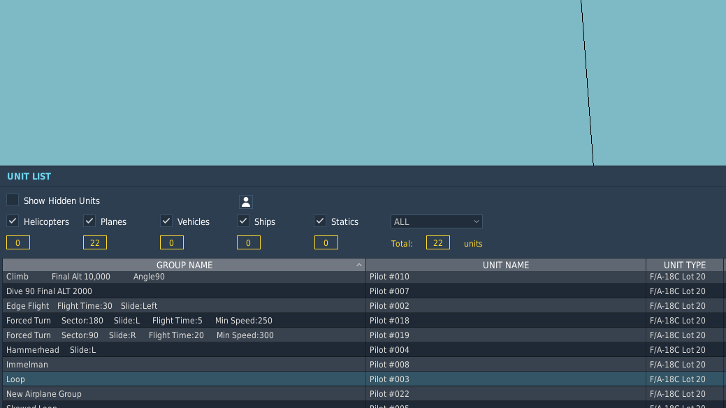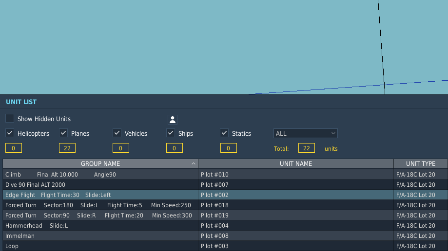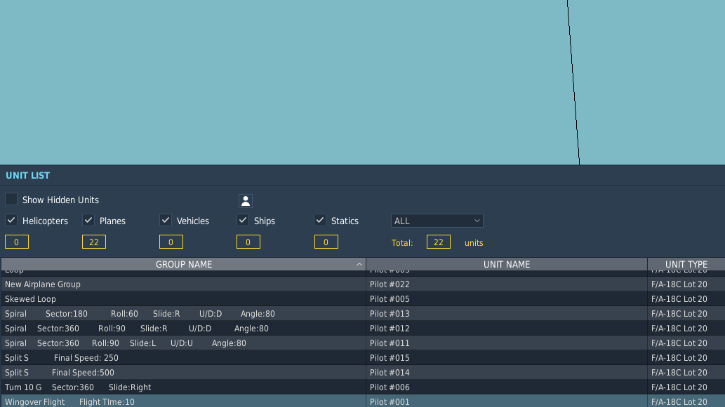 A row of aircraft preform all of the aerobatic maneuvers available as of V 2.5.5.38756, or 11/4/2019. Useful when designing a mission for precise AI movement.