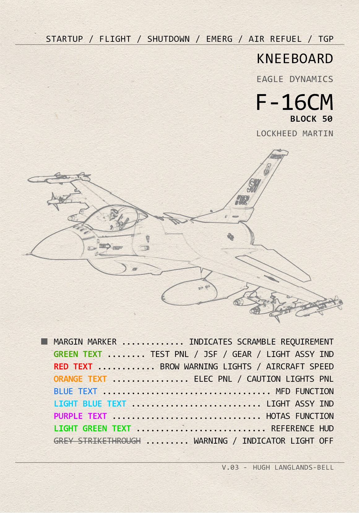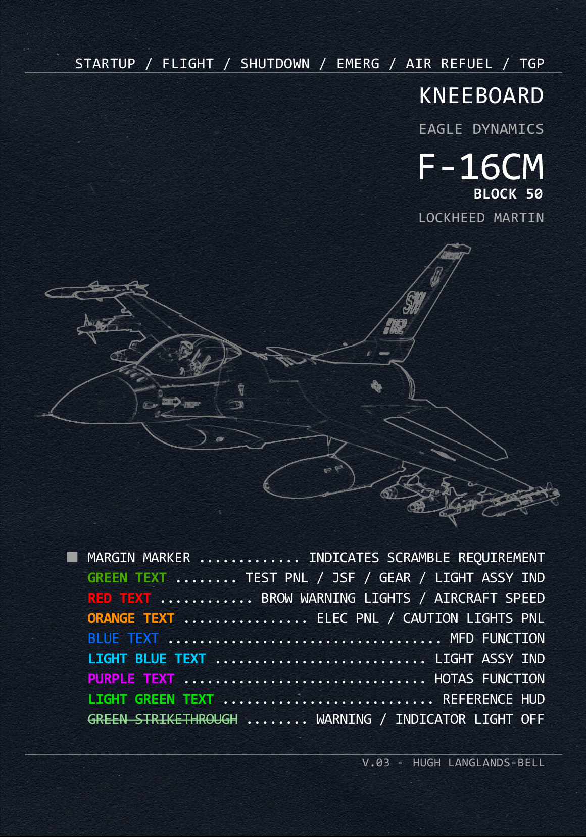 This detailed kneeboard includes day/night versions, and normal/scramble operations. This detailed kneeboard includes day/night versions, and normal/scramble operations. It uses information from the F-16C Flight Manual, but it has primarily been designed to work cohesively with the Eagle Dynamics F-16C Guide, and video tutorials by Matt Wagner. The airborne refuelling, and TGP sections are based on RedKite's comprehensive tutorials. (Both day/night versions total 7 pages, including the cover, in V.03, sample screenshots are of the cover, page 2, and page 6).