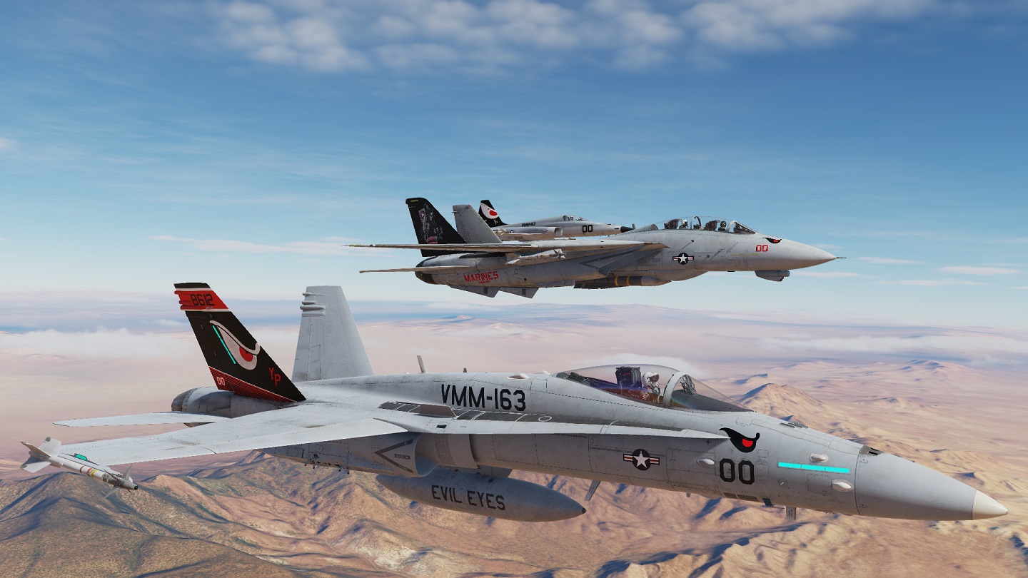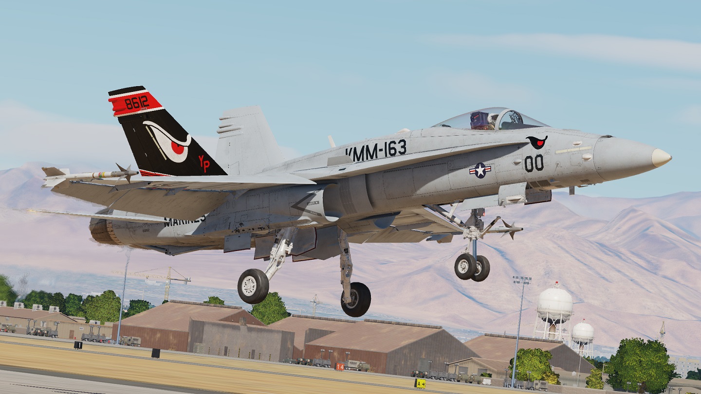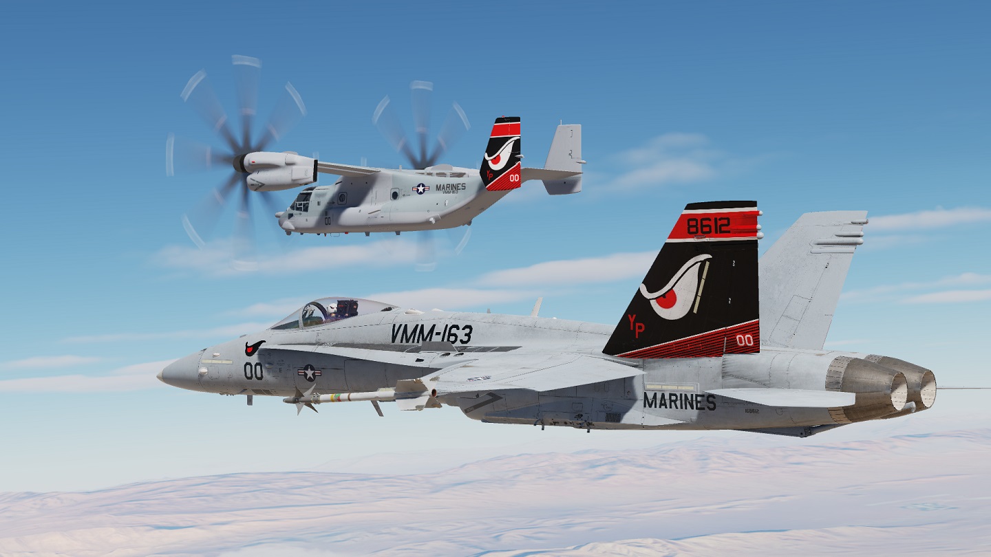 When the squadron is “chopped” to a Marine Expeditionary Unit as the core of the Air Combat Element, additional aircraft squadrons are also attached under the VMM-163 (REIN) designation and don the eponymous eyes on their own aircraft. This skin was a "What If" a Marine Corps F/A-18 Fighter Attack Squadron was attached to the Evil Eyes and wore current VMM-163 flagship livery.
