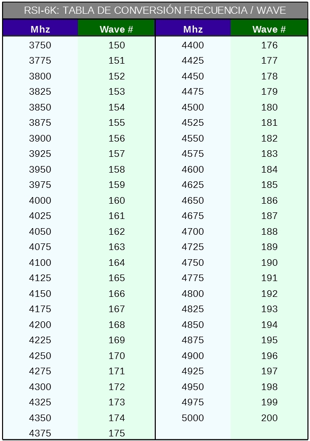 Tabla de conversión frecuencia en Mhz a números 'wave', para la rádio RSI-6K del MiG-15bis.