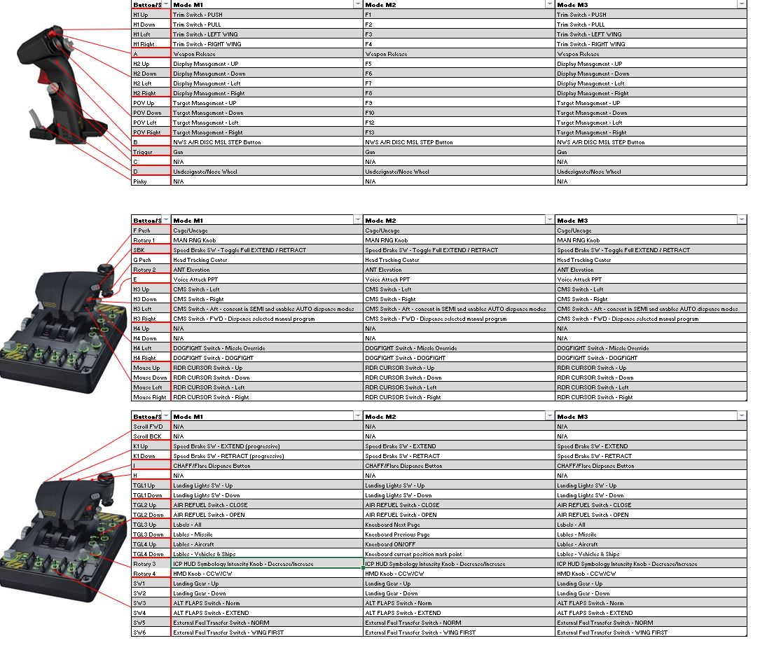 Here is Version 3 of my F-16C Saitek X55 Profile. The package includes both the Saitek X55 profile files as well as the DCS Keyboard, Rudder, Stick and Throttle mapping files and a custom lua for the speed breaks (check install.txt). Make sure to upload the keyboard map as well as some of the functions used in the HOTAS programming required keyboard commands to work. This is still work in progress. Feel free to modify but please post your modifications up for others to use.