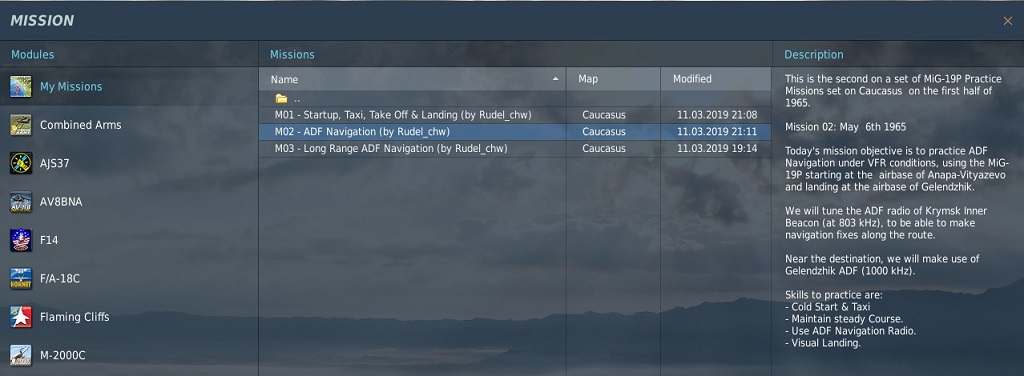 Set of 3 Navigation practice missions for the MiG-19P set on Caucasus. As with all my missions, you need to have the VPC Airfield Mod installed, as I refuse to fly from bare airbases ... you can download it from here: