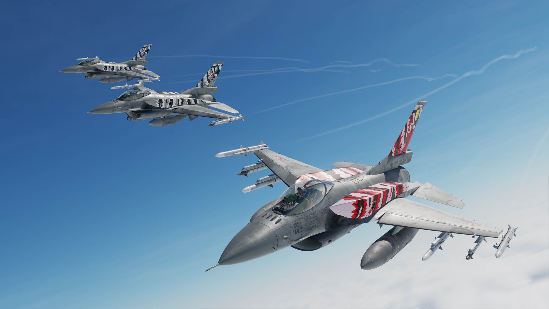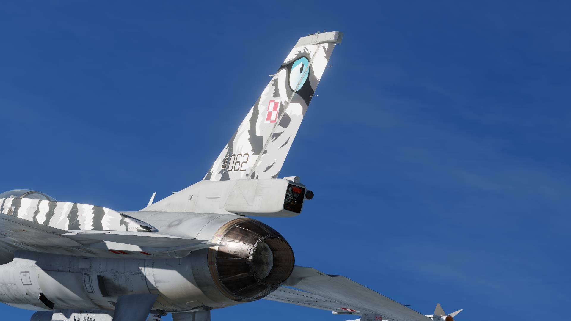 This is a photoreal recreation of 3 Polish Air Force F-16C 52+ Tigermeet Liveries with tons of little extras to make it look as much as a block52+ as possible! The skin is compatbile with Scooby's CFT mod and has very detailed and weahtered CFT's and a parachute holder texture. Panels on the jet have been added seen on real jets to accomodate CFT plumbing. Custom IFF antenna in the front, custom patches, a flag in the cockpit and custom dirty fuel tanks are just a few of the details on this skin.