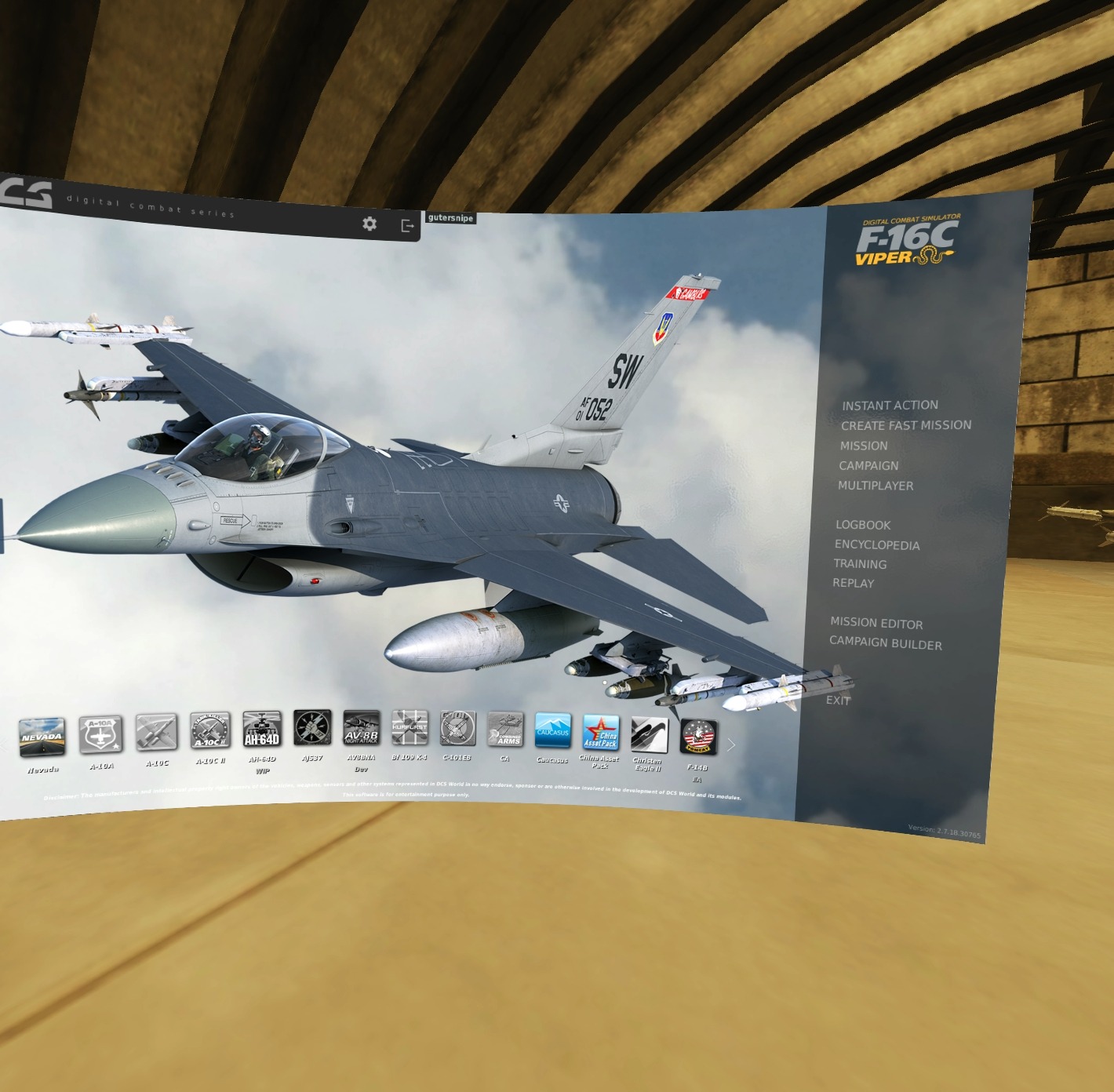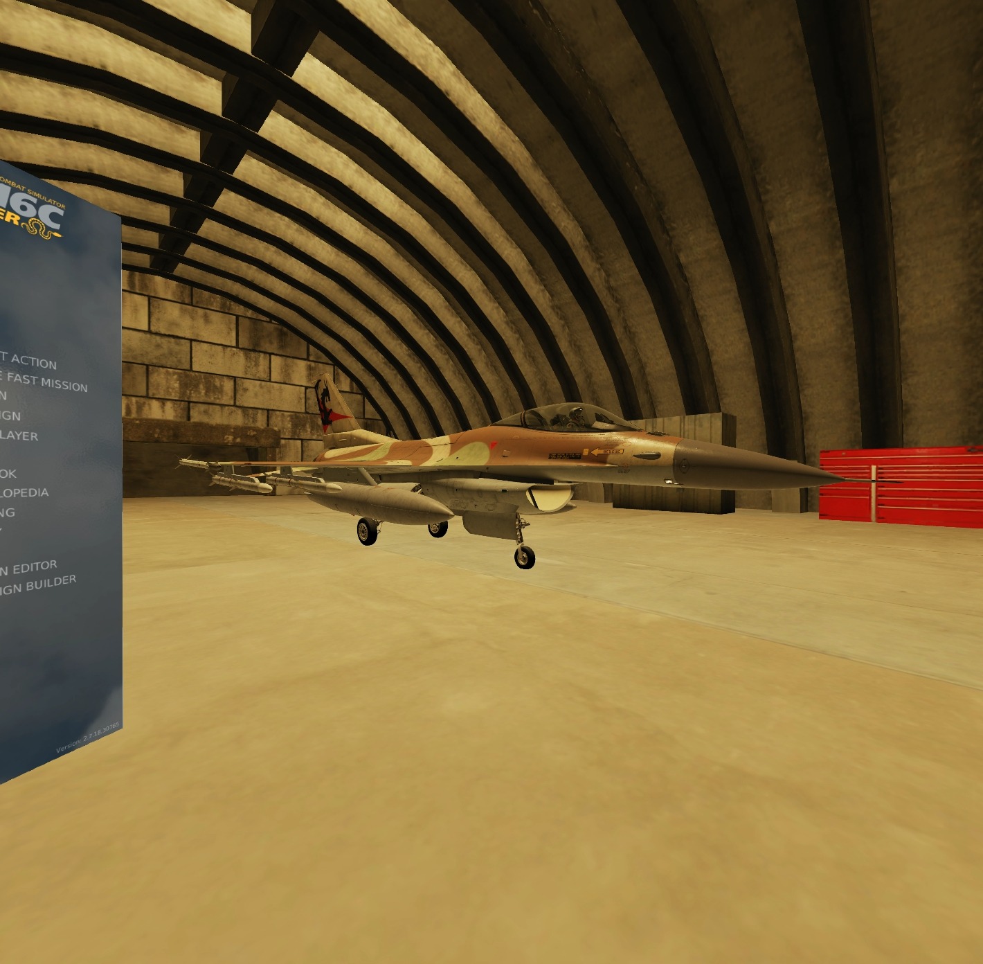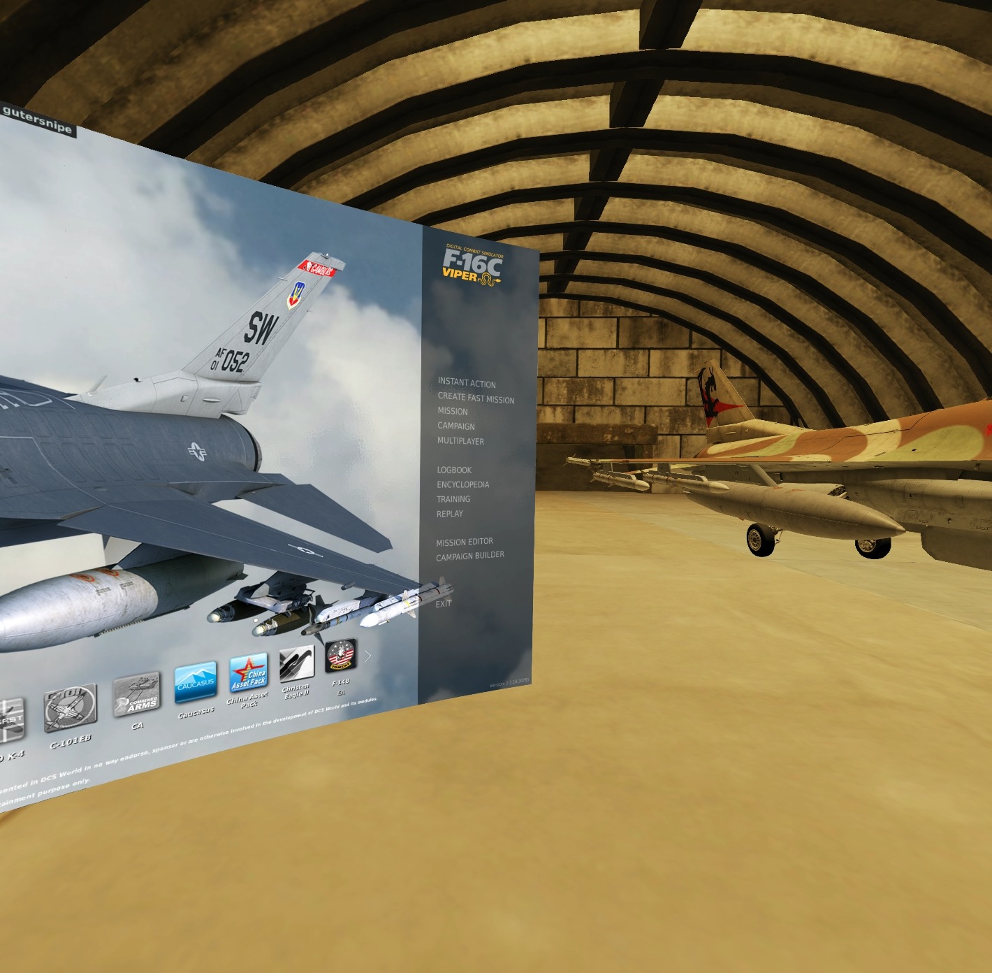 This mod replaces the Default Plane in the VR Hangar with an F-16C plane. The plane has some air to air missiles and fuel tanks. I also changed in the POV so you can see more of the plane. To install: Rename/Backup the sceneVR.lau file found in the DCS installation directory (for example: C:\Games\DCSWorld\Scripts\DemoScenes) to something like sceneVR.lau.orig and then place the sceneVR.lau file from the mod in that directory. Start the game and it should work.